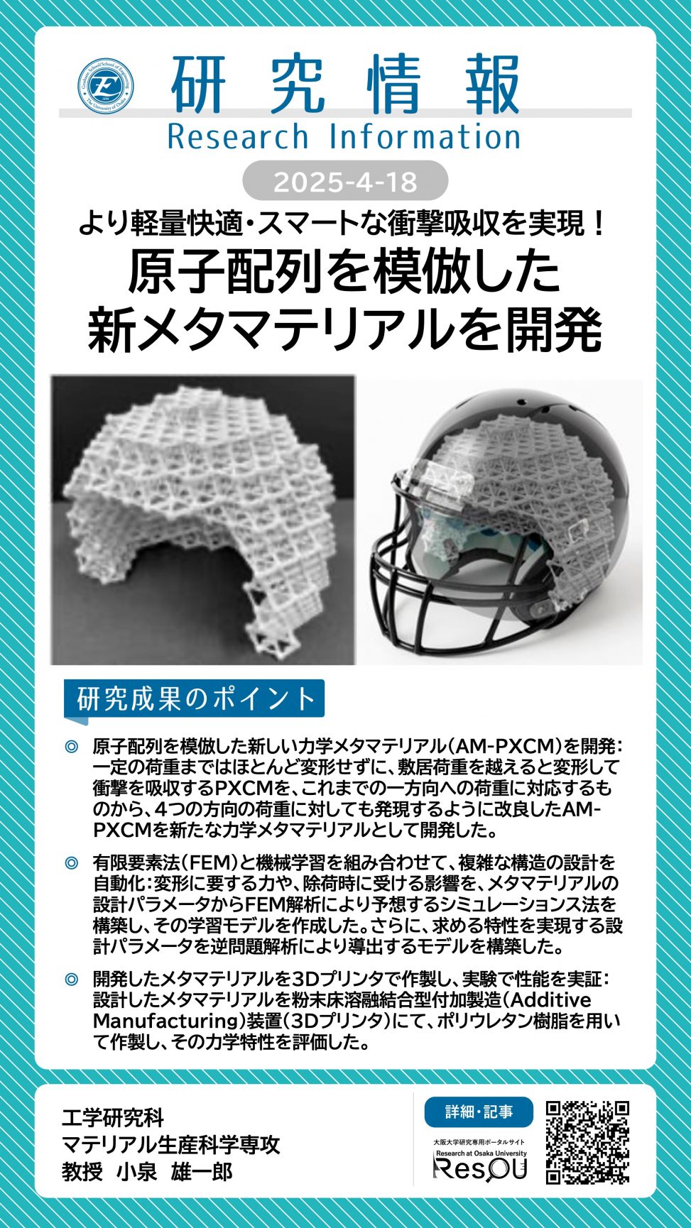 より軽量快適・スマートな衝撃吸収を実現! 原子配列を模倣した新メタマテリアルを開発 詳細ページ https://resou.osaka-u.ac.jp/ja/research/2025/20250418_2 2025年4月18日 投稿先 研究情報, 応用理工学科, マテリアル生産科学専攻 ← 過去の投稿へ 次の投稿へ →