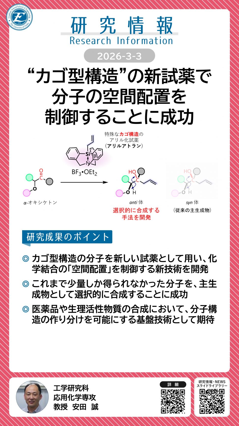 “カゴ型構造”の新試薬で 分子の空間配置を制御することに成功 詳細ページ https://resou.osaka-u.ac.jp/ja/research/2026/20260303_2 2026年3月3日 投稿先 応用自然科学科, 研究情報, 応用化学専攻 ← 過去の投稿へ 次の投稿へ →