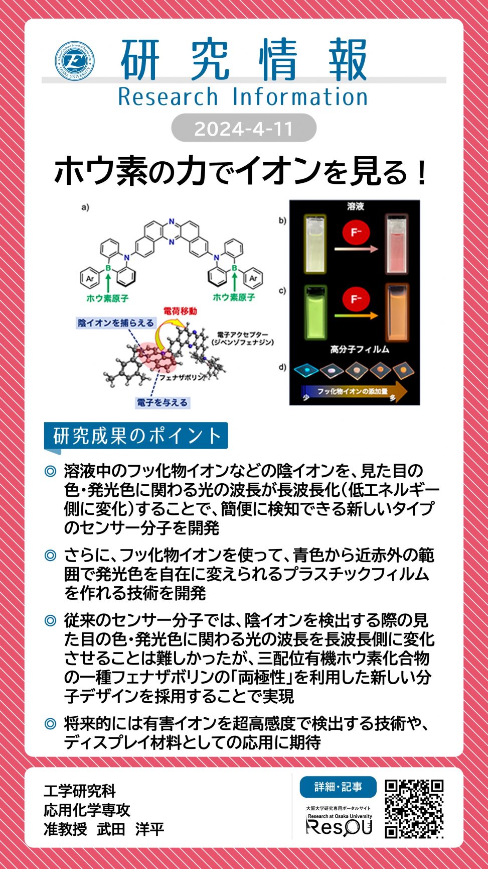 ホウ素の力でイオンを見る! 詳細ページ https://resou.osaka-u.ac.jp/ja/research/2024/20240411_2 2024年4月11日 投稿先 応用自然科学科, 研究情報, 応用化学専攻 ← 過去の投稿へ 次の投稿へ →