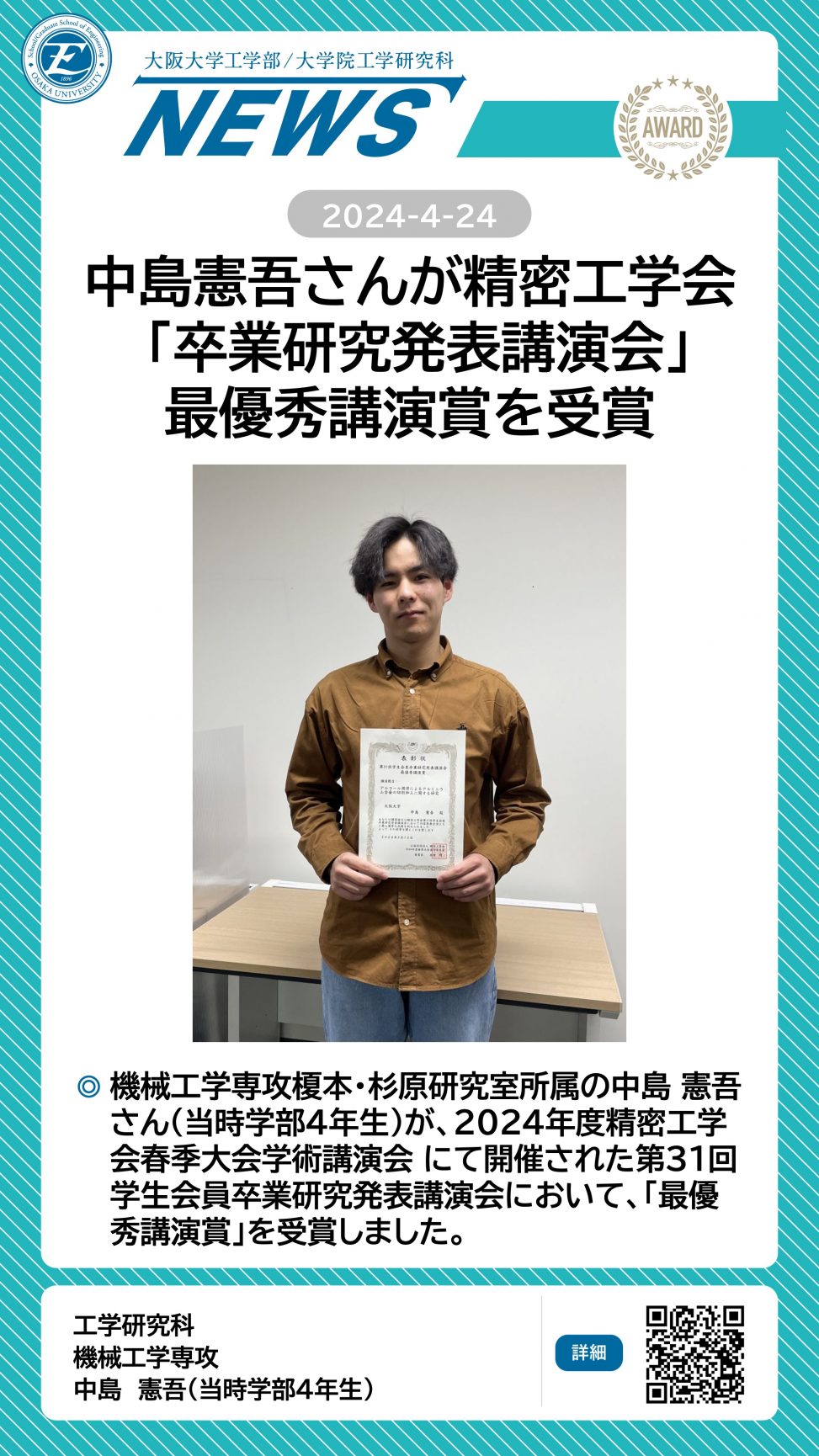 中島憲吾さんが精密工学会 「卒業研究発表講演会」最優秀講演賞を受賞 詳細ページ https://www.eng.osaka-u.ac.jp/ja/topics/researchresult/20259 2024年4月24日 投稿先 NEWS, 応用理工学科, 機械工学専攻 ← 過去の投稿へ 次の投稿へ →