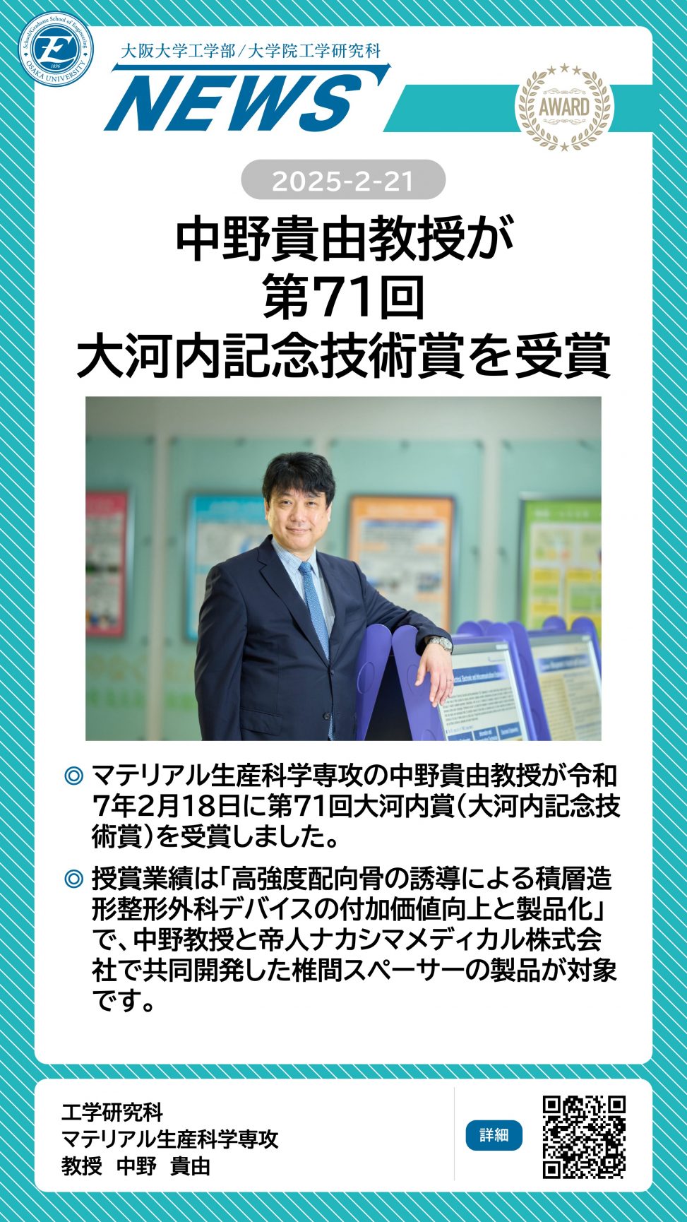 中野貴由教授が第71回大河内記念技術賞を受賞しました 詳細ページ https://www.eng.osaka-u.ac.jp/ja/topics/researchresult/24166 2025年2月21日 投稿先 NEWS, 応用理工学科, マテリアル生産科学専攻 ← 過去の投稿へ 次の投稿へ →
