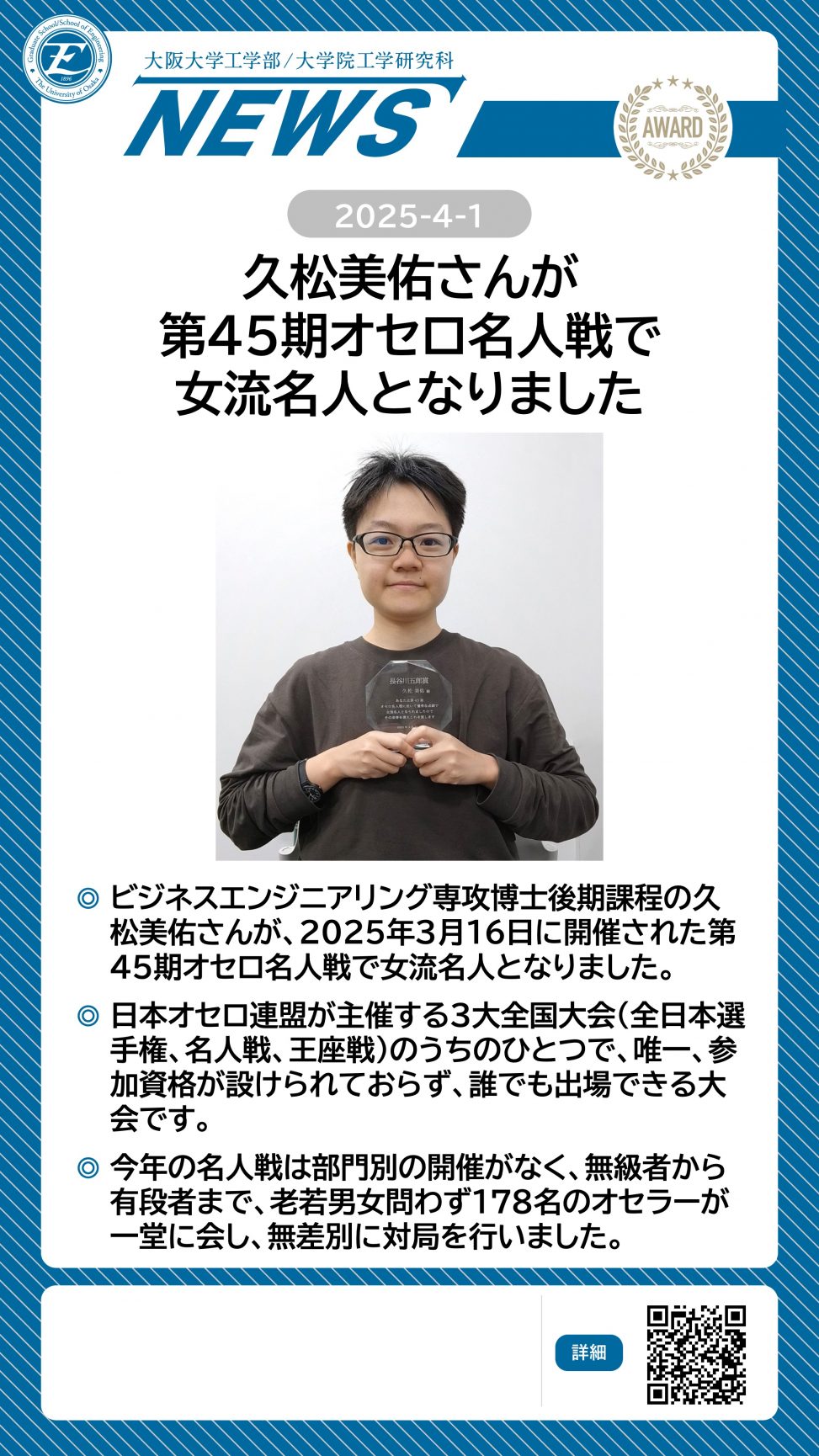 久松美佑さんが第45期オセロ名人戦で女流名人となりました 詳細ページ https://www.eng.osaka-u.ac.jp/ja/topics/news/24765 2025年4月1日 投稿先 NEWS, ビジネスエンジニアリング専攻 ← 過去の投稿へ 次の投稿へ →