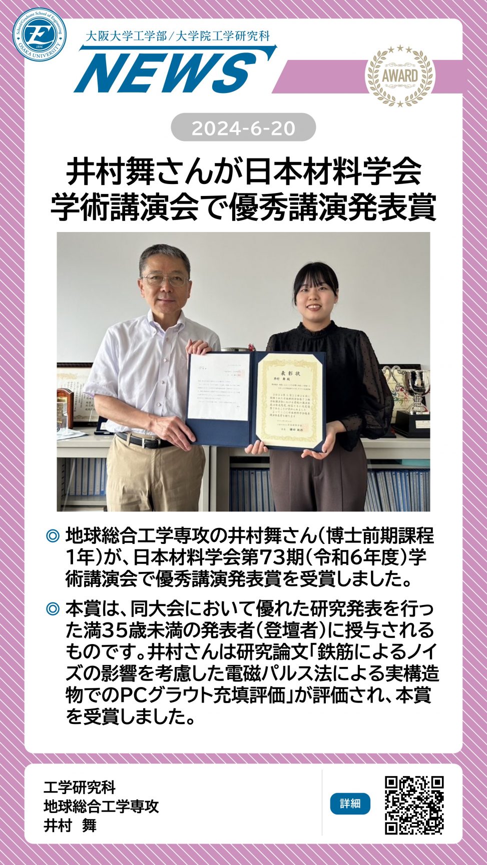 井村舞さんが日本材料学会学術講演会で優秀講演発表賞を受賞 詳細ページ https://www.eng.osaka-u.ac.jp/ja/topics/researchresult/20974 2024年6月20日 投稿先 NEWS, 地球総合工学科, 地球総合工学専攻 ← 過去の投稿へ 次の投稿へ →