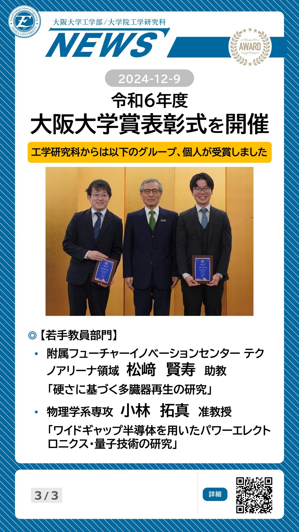 令和6年度大阪大学賞表彰式を開催しました 3/3 詳細ページ https://www.eng.osaka-u.ac.jp/ja/topics/news/22908 2024年12月9日 投稿先 NEWS ← 過去の投稿へ 次の投稿へ →