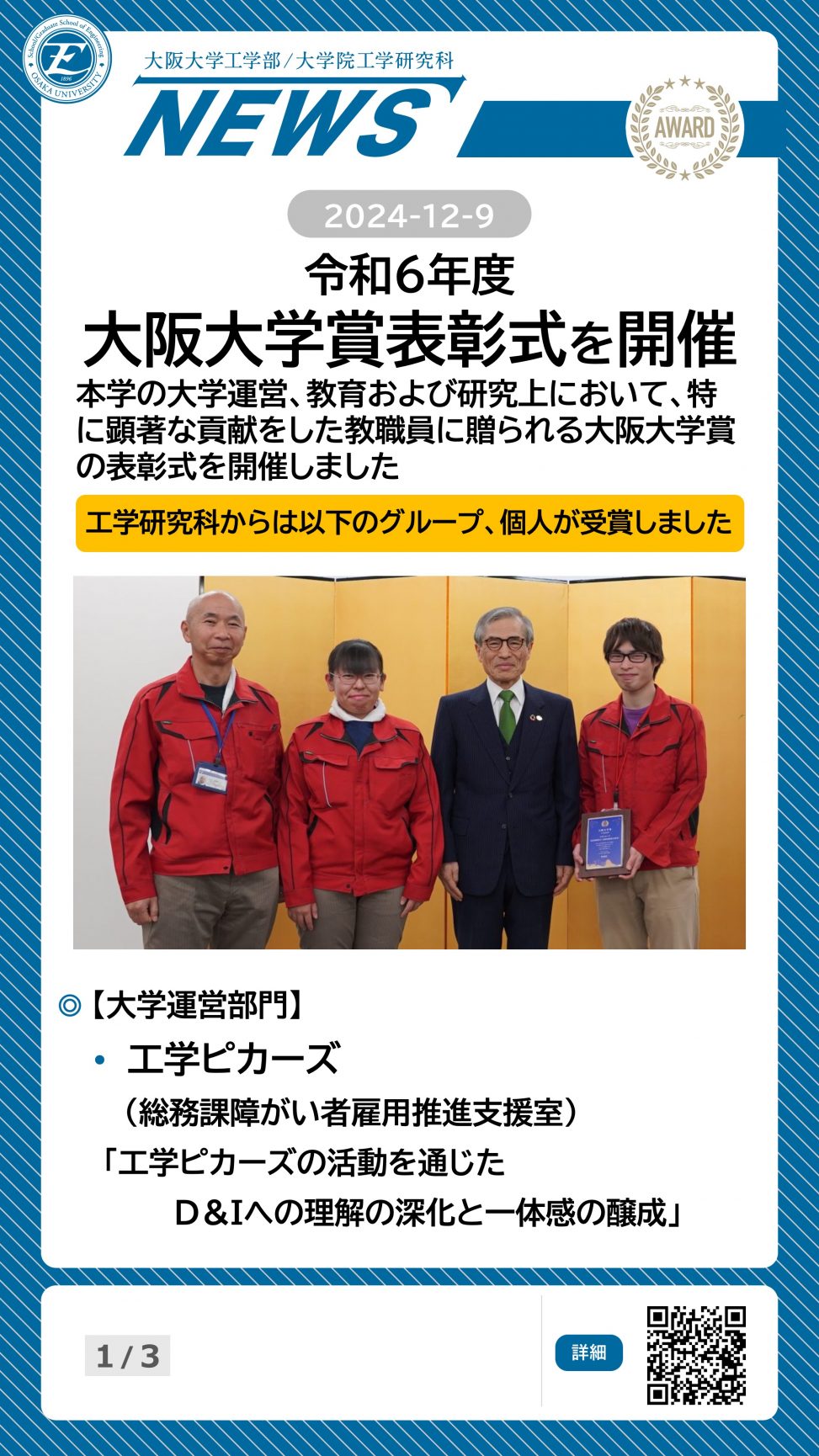令和6年度大阪大学賞表彰式を開催しました 1/3 詳細ページ https://www.eng.osaka-u.ac.jp/ja/topics/news/22908 2024年12月9日 投稿先 NEWS ← 過去の投稿へ 次の投稿へ →