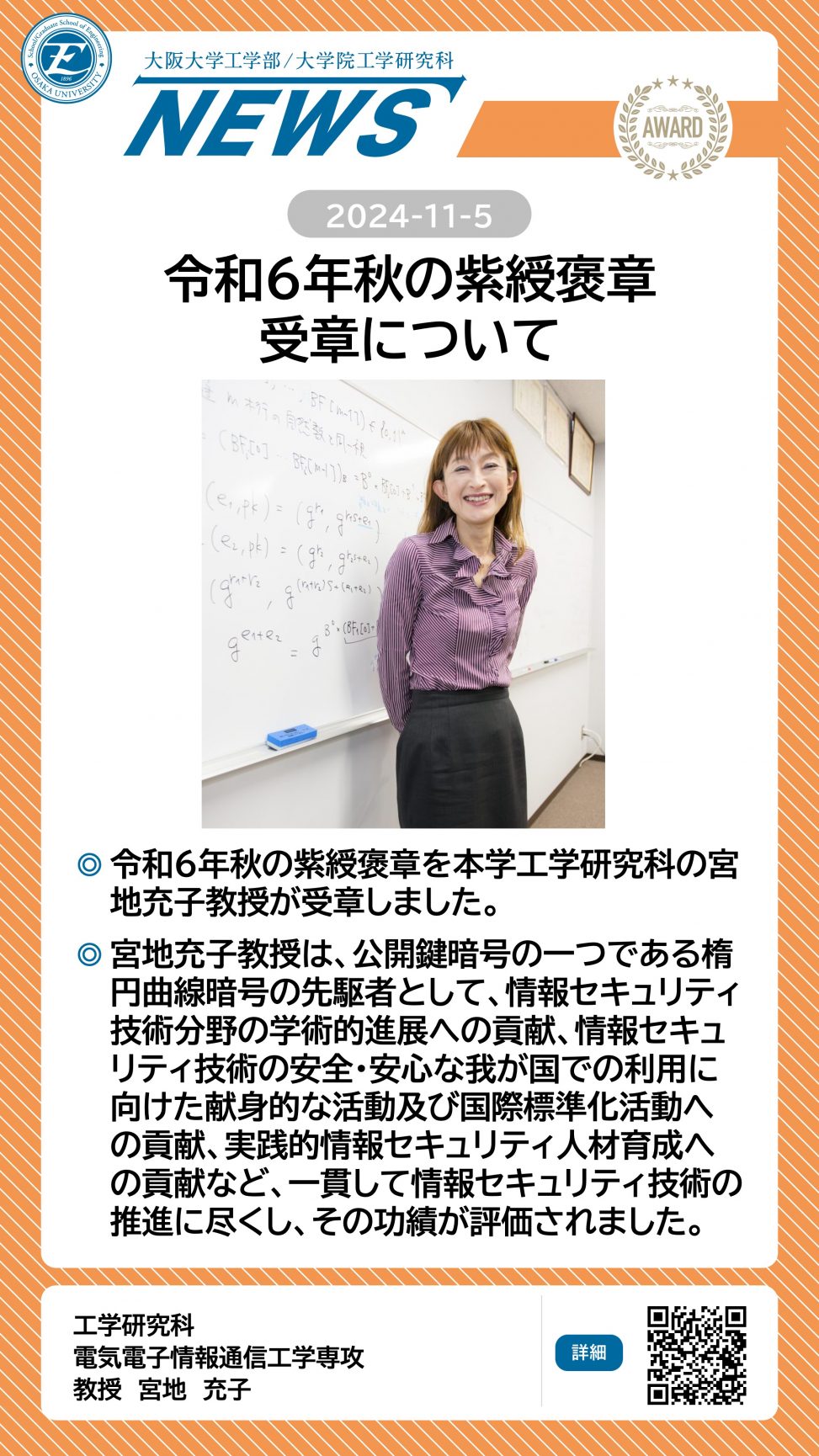 令和6年秋の紫綬褒章受章について 工学研究科の宮地充子教授が受章しました。 詳細ページ https://www.eng.osaka-u.ac.jp/ja/topics/news/22628 2024年11月5日 投稿先 NEWS, 電子情報工学科, 電気電子情報通信工学専攻 ← 過去の投稿へ 次の投稿へ →