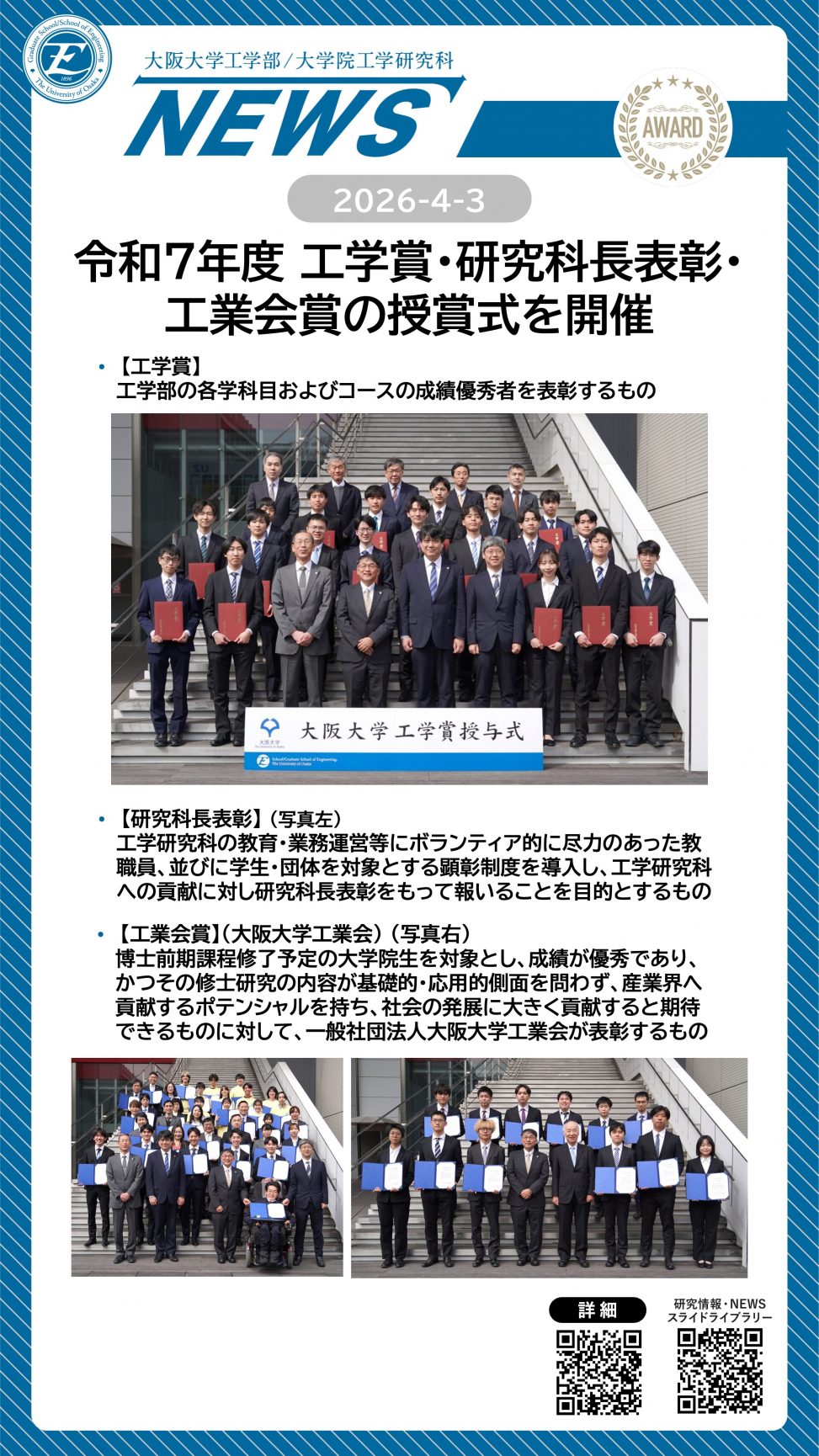 令和7年度 工学賞・研究科長表彰・工業会賞の授賞式を開催しました 詳細ページ https://www.eng.osaka-u.ac.jp/ja/topics/news/29188 2026年4月3日 投稿先 NEWS ← 過去の投稿へ 次の投稿へ →
