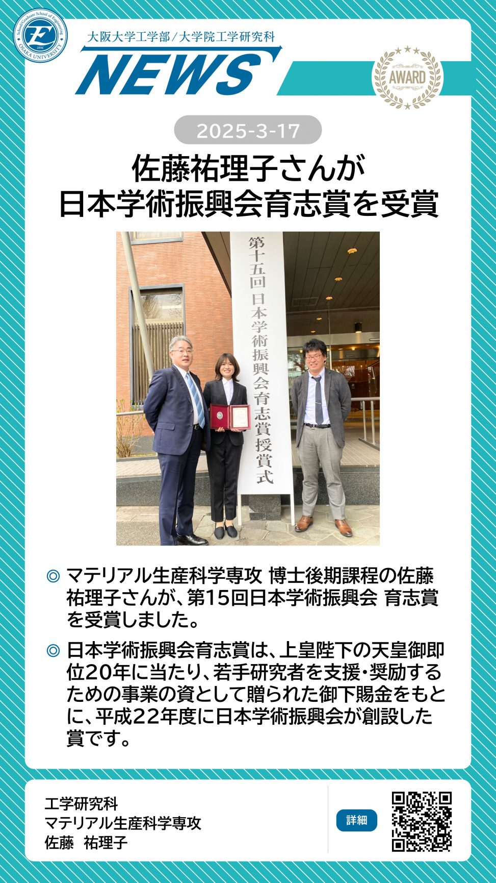 佐藤祐理子さんが日本学術振興会 育志賞を受賞しました 詳細ページ https://www.eng.osaka-u.ac.jp/ja/topics/researchresult/24376 2025年3月17日 投稿先 NEWS, 応用理工学科, マテリアル生産科学専攻 ← 過去の投稿へ 次の投稿へ →
