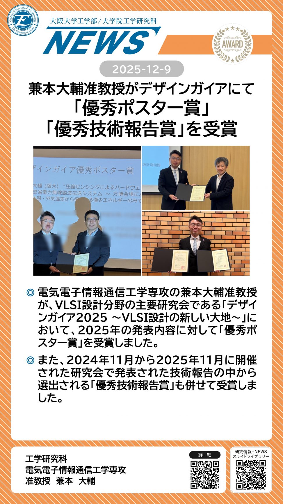 兼本大輔准教授がデザインガイアにて「優秀ポスター賞」「優秀技術報告賞」を受賞しました 詳細ページ https://www.eng.osaka-u.ac.jp/ja/topics/researchresult/27805 2025年12月9日 投稿先 NEWS, 電子情報工学科, 電気電子情報通信工学専攻 ← 過去の投稿へ 次の投稿へ →