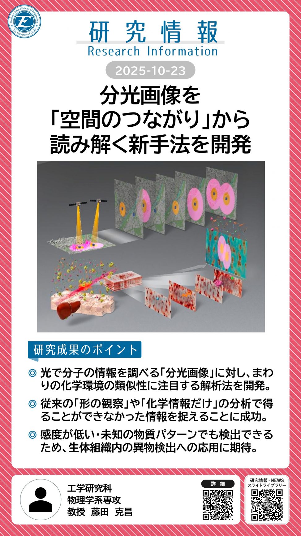 分光画像を「空間のつながり」から読み解く新手法を開発 詳細ページ https://resou.osaka-u.ac.jp/ja/research/2025/20251023_3 2025年10月23日 投稿先 応用自然科学科, 研究情報, 物理学系専攻 ← 過去の投稿へ 次の投稿へ →