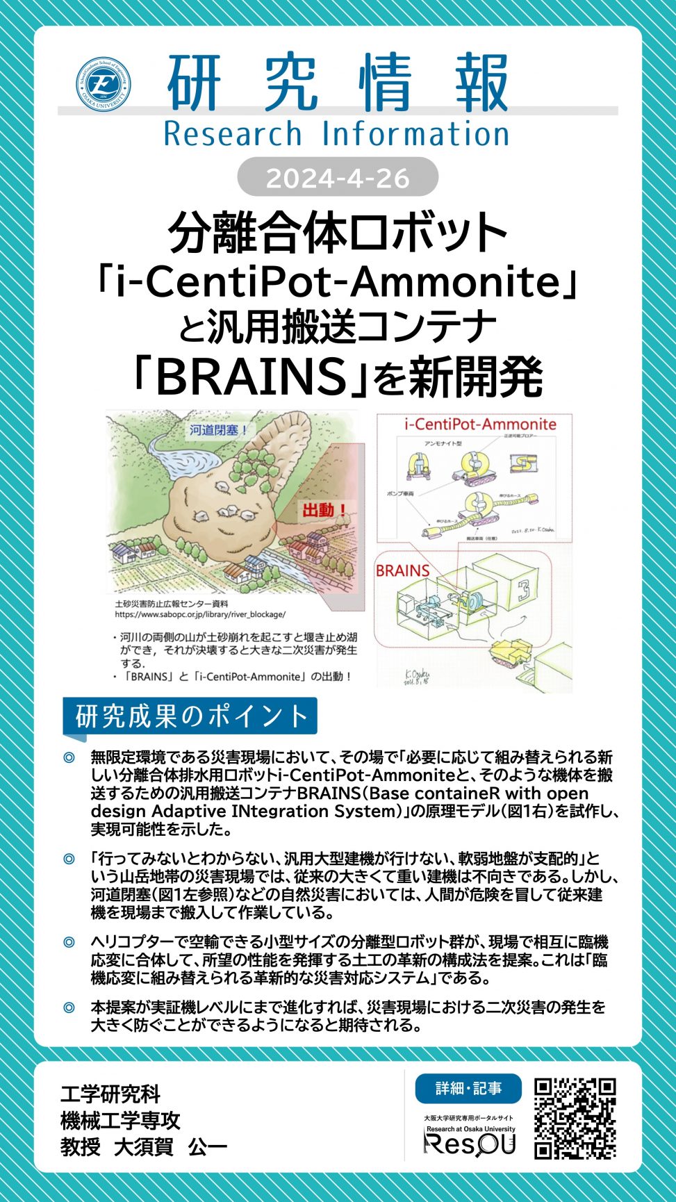分離合体ロボット「i-CentiPot-Ammonite」と 汎用搬送コンテナ「BRAINS」を新開発 詳細ページ https://resou.osaka-u.ac.jp/ja/research/2024/20240426_2 2024年4月26日 投稿先 研究情報, 応用理工学科, 機械工学専攻 ← 過去の投稿へ 次の投稿へ →