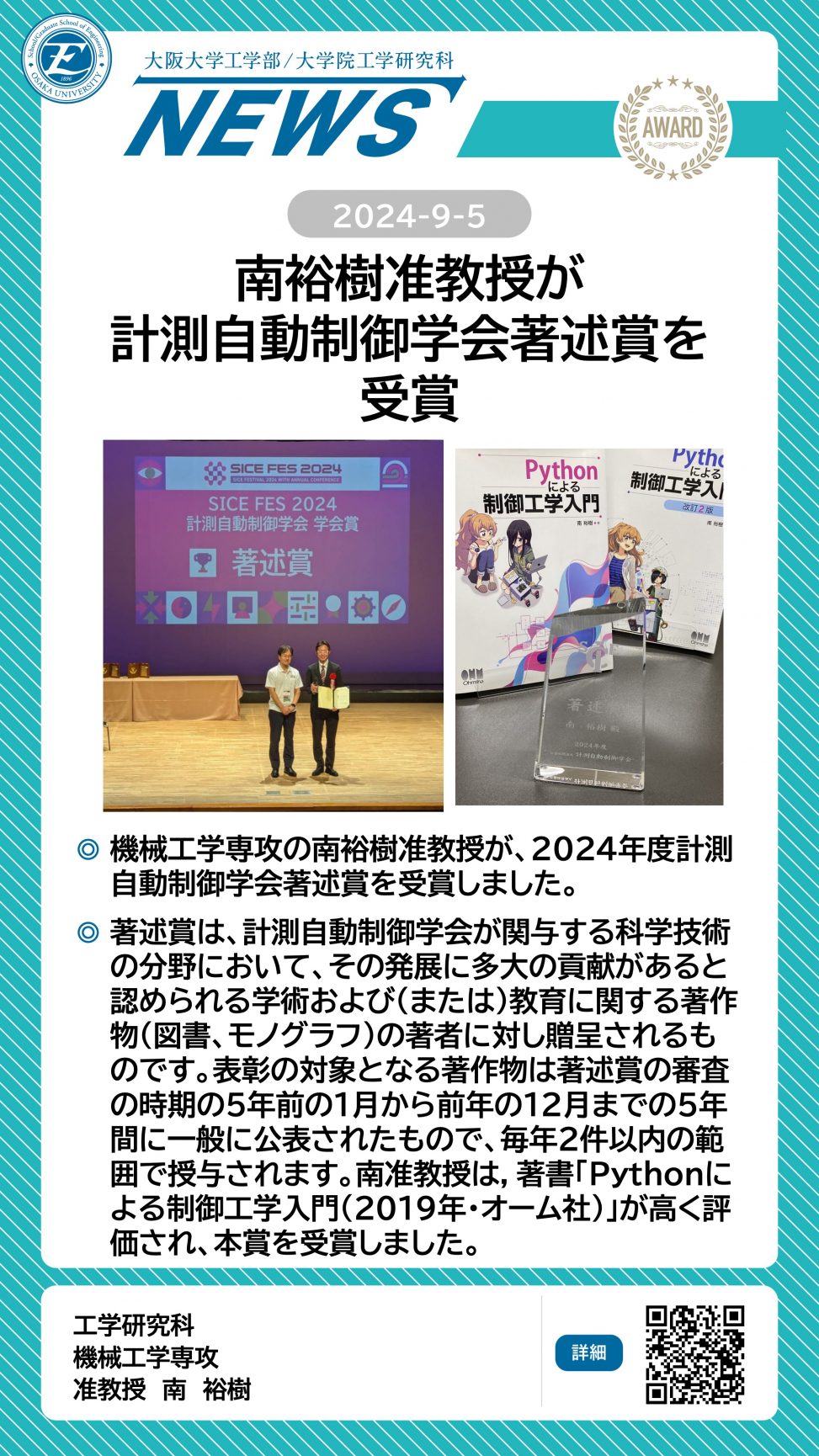 南裕樹准教授が計測自動制御学会著述賞を受賞 詳細ページ https://www.eng.osaka-u.ac.jp/ja/topics/researchresult/21715 2024年9月5日 投稿先 NEWS, 応用理工学科, 機械工学専攻 ← 過去の投稿へ 次の投稿へ →
