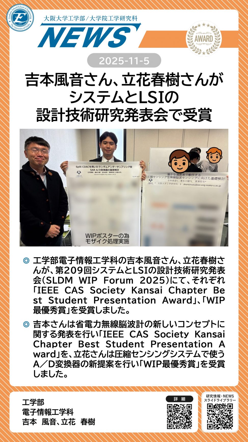 吉本風音さん、立花春樹さんがシステムとLSIの設計技術研究発表会で受賞しました 詳細ページ https://www.eng.osaka-u.ac.jp/ja/topics/researchresult/27493 2025年11月5日 投稿先 NEWS, 電子情報工学科, 電気電子情報通信工学専攻 ← 過去の投稿へ