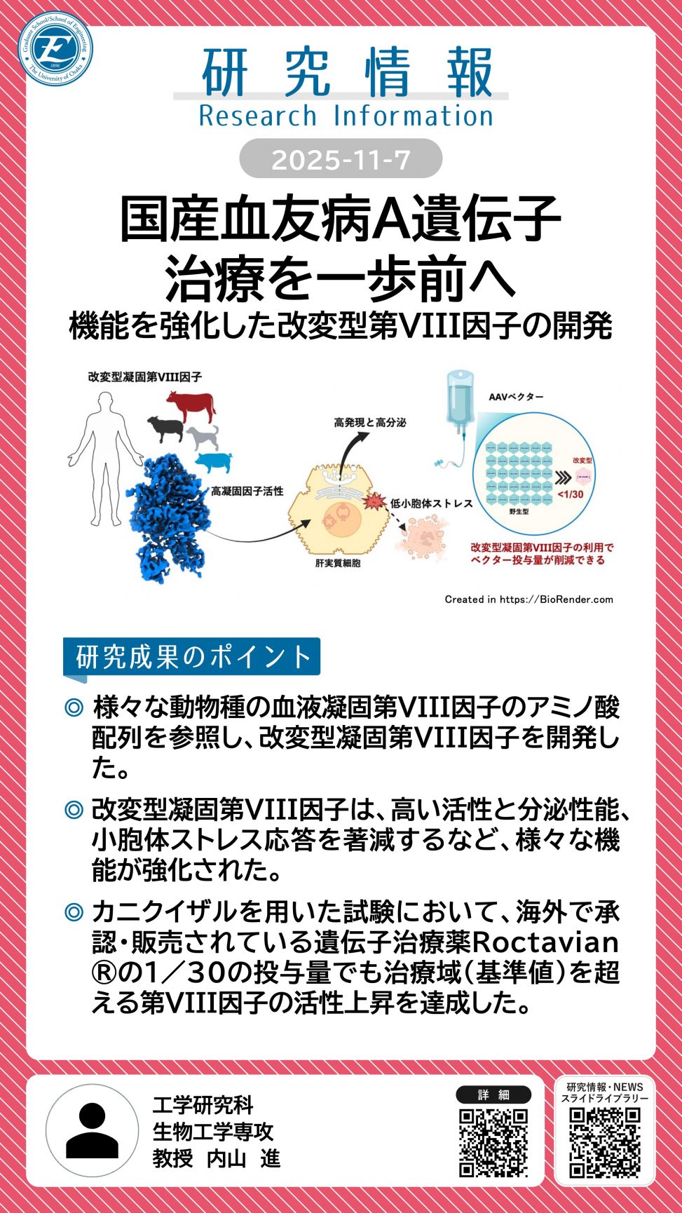国産血友病A遺伝子治療を一歩前へ 詳細ページ https://resou.osaka-u.ac.jp/ja/research/2025/20251107_2 2025年11月7日 投稿先 生物工学専攻, 応用自然科学科, 研究情報 ← 過去の投稿へ 次の投稿へ →