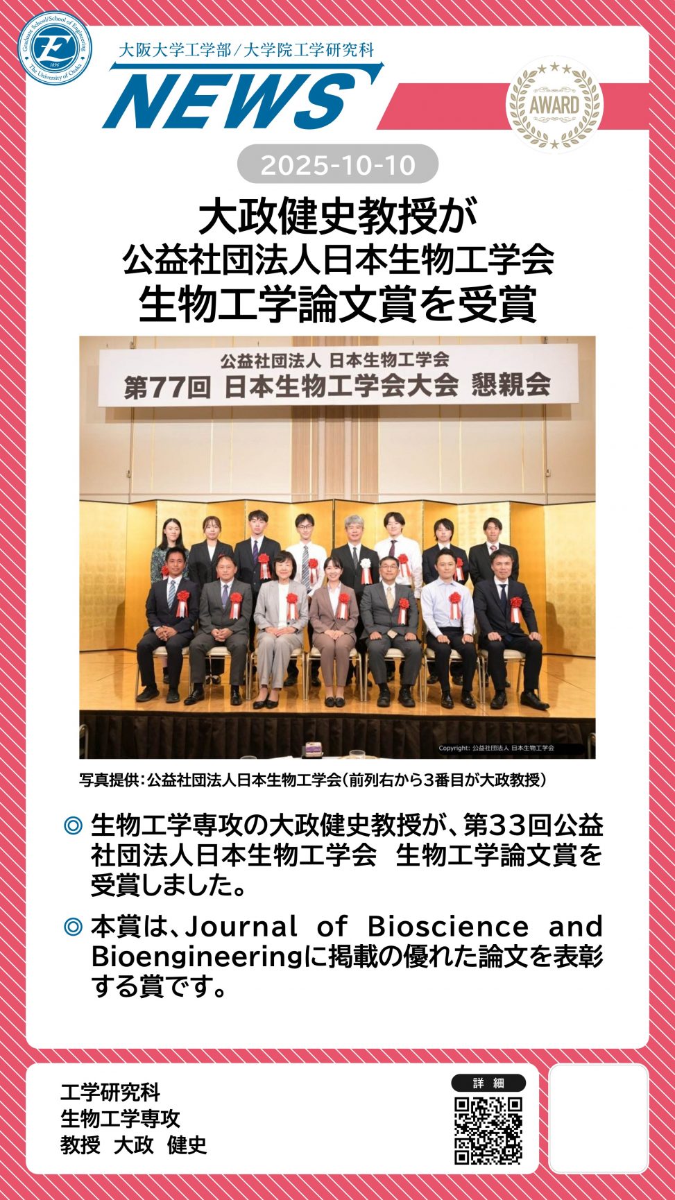 大政健史教授が公益社団法人日本生物工学会 生物工学論文賞を受賞しました 詳細ページ https://www.eng.osaka-u.ac.jp/ja/topics/researchresult/27132 2025年10月10日 投稿先 NEWS, 生物工学専攻, 応用自然科学科 ← 過去の投稿へ 次の投稿へ →