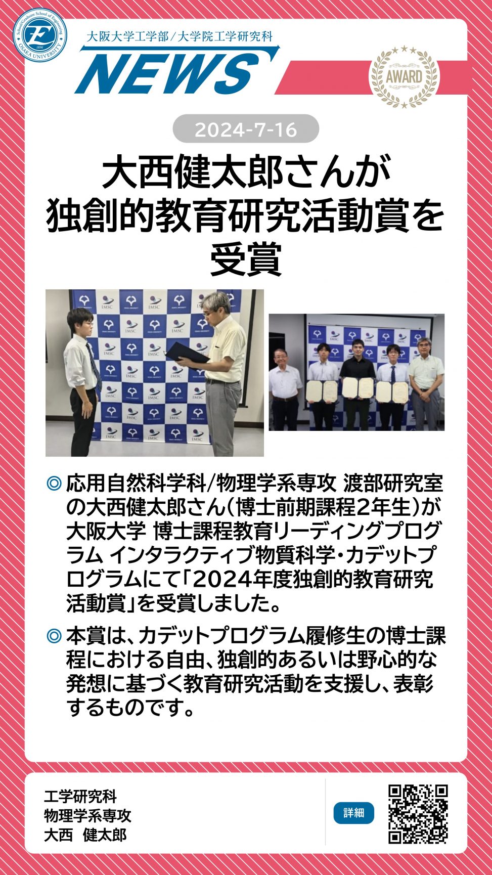 大西健太郎さんが独創的教育研究活動賞を受賞 詳細ページ https://www.eng.osaka-u.ac.jp/ja/topics/researchresult/21186 2024年7月16日 投稿先 NEWS, 応用自然科学科, 物理学系専攻 ← 過去の投稿へ 次の投稿へ →