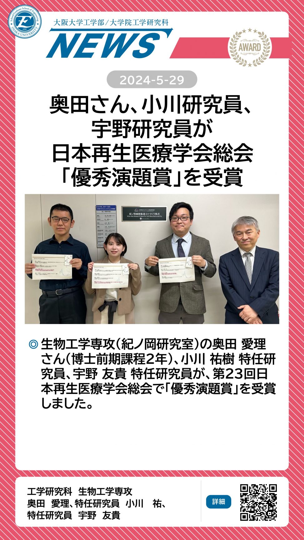 奥田さん、小川研究員、宇野研究員が日本再生医療学会総会「優秀演題賞」を受賞 詳細ページ https://www.eng.osaka-u.ac.jp/ja/topics/researchresult/20621 2024年5月29日 投稿先 NEWS, 生物工学専攻, 応用自然科学科 ← 過去の投稿へ 次の投稿へ →