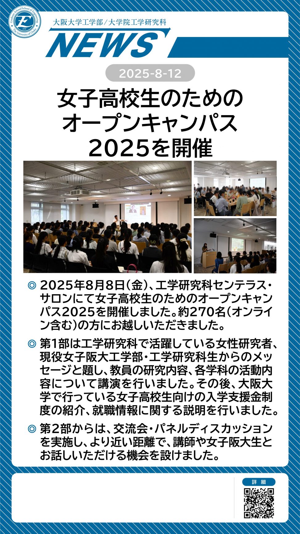 女子高校生のためのオープンキャンパス2025を開催しました 詳細ページ https://www.eng.osaka-u.ac.jp/ja/topics/news/26349 2025年8月12日 投稿先 NEWS ← 過去の投稿へ 次の投稿へ →