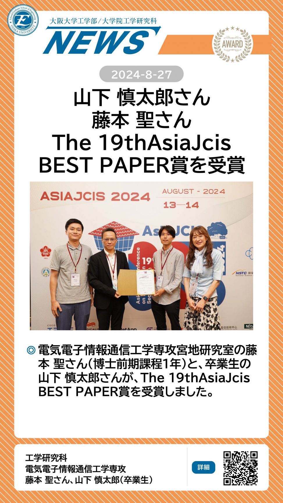 山下 慎太郎さん、藤本 聖さんがThe 19thAsiaJcis BEST PAPER賞を受賞 詳細ページ https://www.eng.osaka-u.ac.jp/ja/topics/researchresult/21597 2024年8月27日 投稿先 NEWS, 電子情報工学科, 電気電子情報通信工学専攻 ← 過去の投稿へ 次の投稿へ →