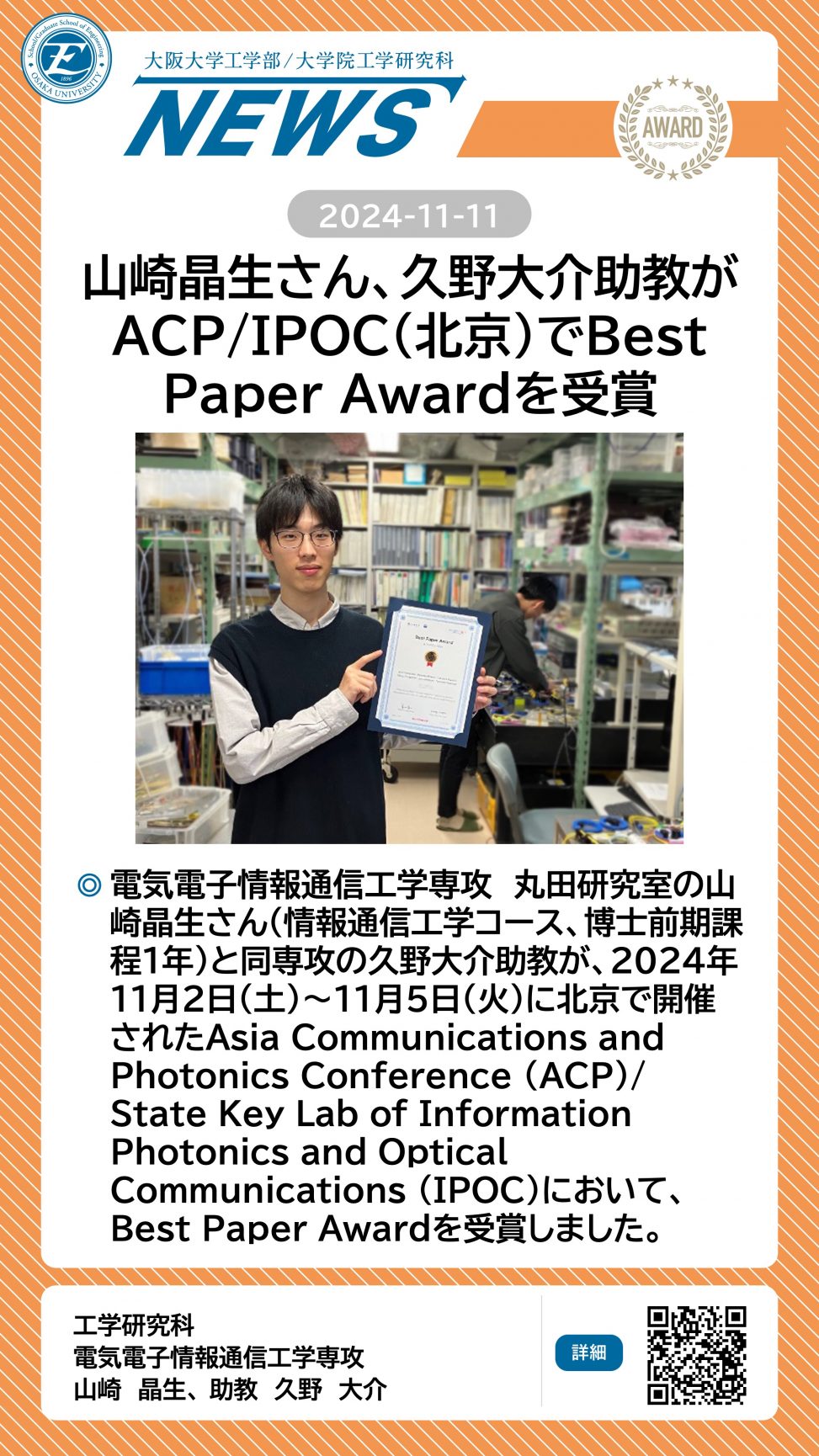 山崎晶生さん、久野大介助教がACP/IPOC(北京)でBest Paper Awardを受賞しました 詳細ページ https://www.eng.osaka-u.ac.jp/ja/topics/researchresult/22687 2024年11月11日 投稿先 NEWS, 電子情報工学科, 電気電子情報通信工学専攻 ← 過去の投稿へ 次の投稿へ →