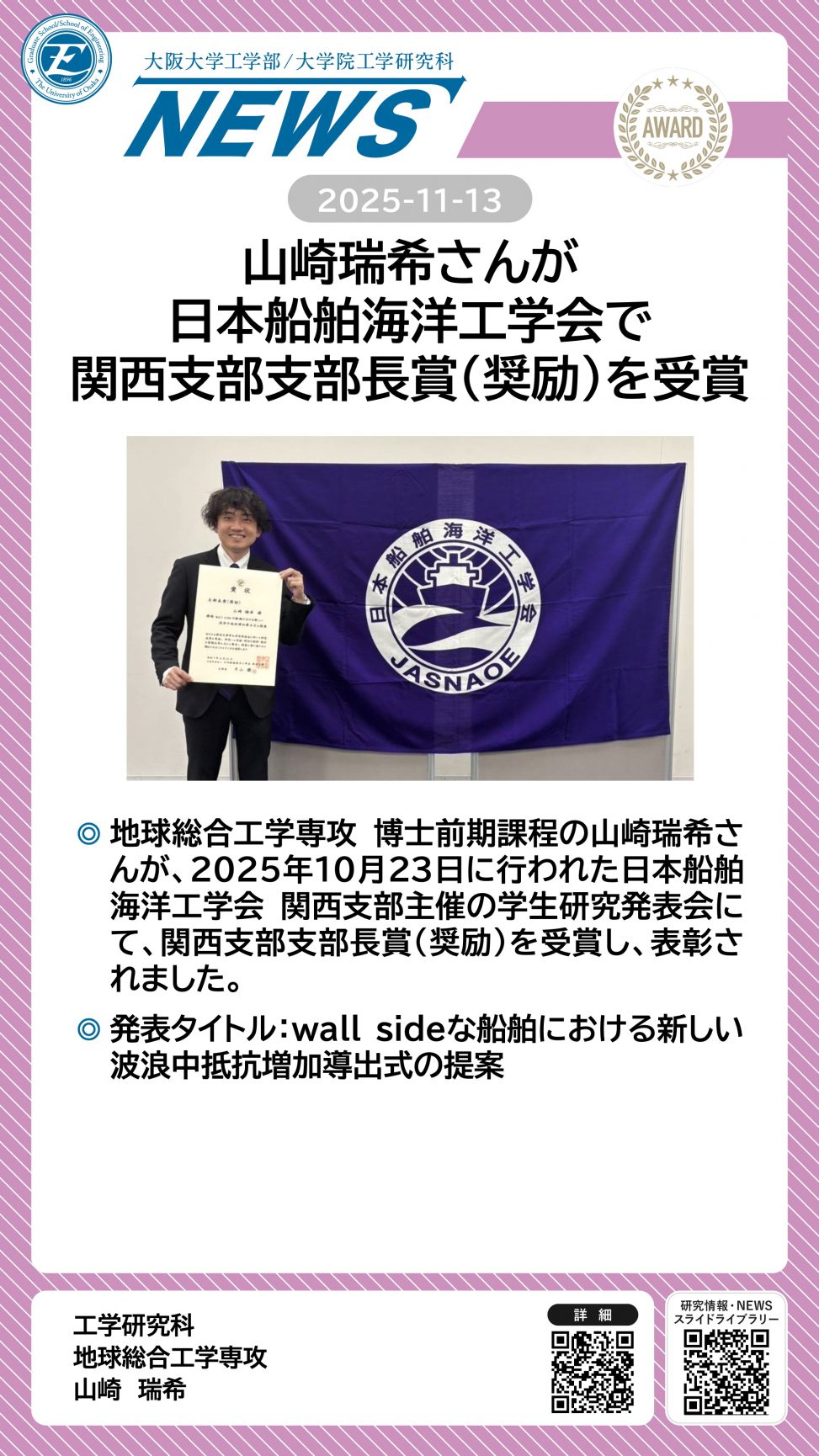 山崎瑞希さんが日本船舶海洋工学会で関西支部支部長賞(奨励)を受賞しました 詳細ページ https://www.eng.osaka-u.ac.jp/ja/topics/researchresult/27592 2025年11月13日 投稿先 NEWS, 地球総合工学科, 地球総合工学専攻 ← 過去の投稿へ 次の投稿へ →