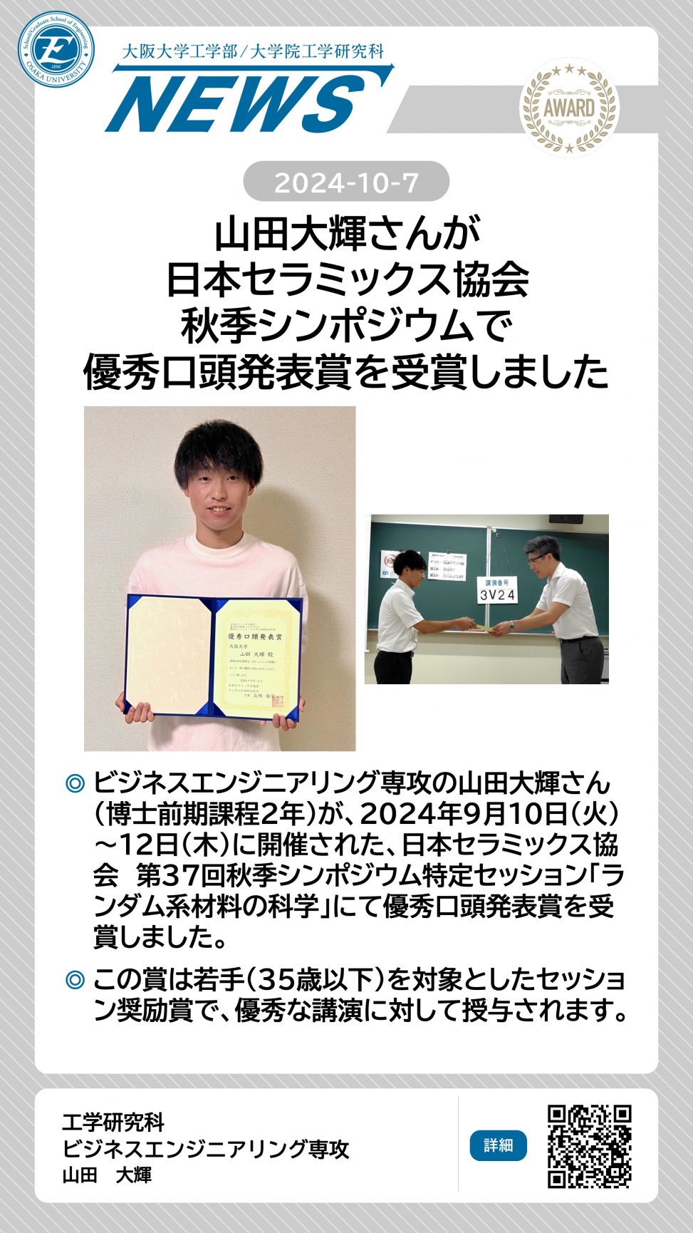 山田大輝さんが日本セラミックス協会秋季シンポジウムで優秀口頭発表賞を受賞しました 詳細ページ https://www.eng.osaka-u.ac.jp/ja/topics/researchresult/22283 2024年10月7日 投稿先 NEWS, ビジネスエンジニアリング専攻 ← 過去の投稿へ 次の投稿へ →