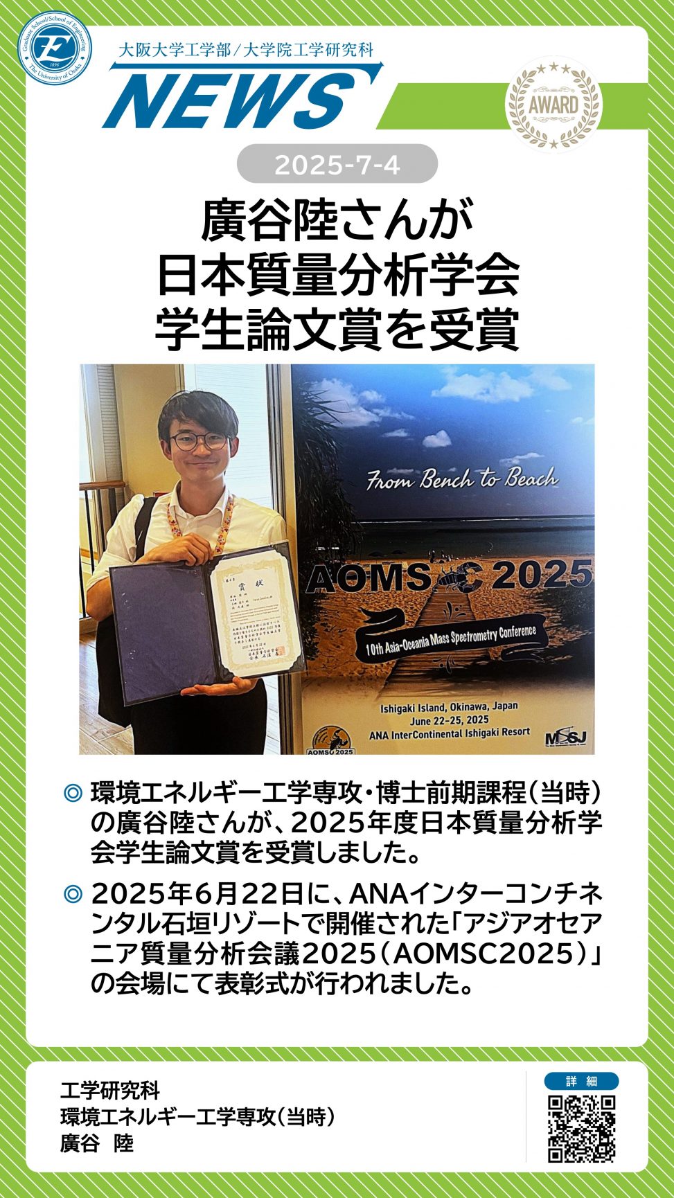 廣谷陸さんが日本質量分析学会学生論文賞を受賞しました https://www.eng.osaka-u.ac.jp/ja/topics/researchresult/25760 2025年7月4日 投稿先 NEWS, 環境・エネルギー工学科, 環境エネルギー工学専攻 ← 過去の投稿へ 次の投稿へ →
