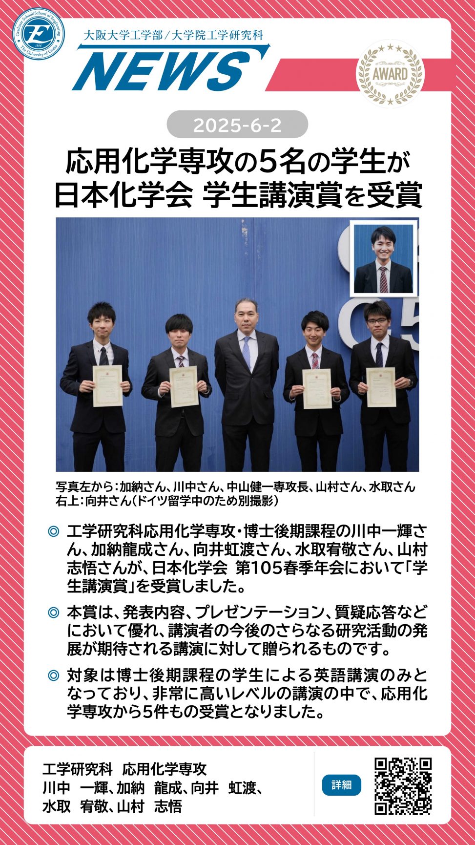 応用化学専攻の5名の学生が日本化学会 学生講演賞を受賞しました 詳細ページ https://www.eng.osaka-u.ac.jp/ja/topics/researchresult/25275 2025年6月2日 投稿先 応用自然科学科, NEWS, 応用化学専攻 ← 過去の投稿へ 次の投稿へ →
