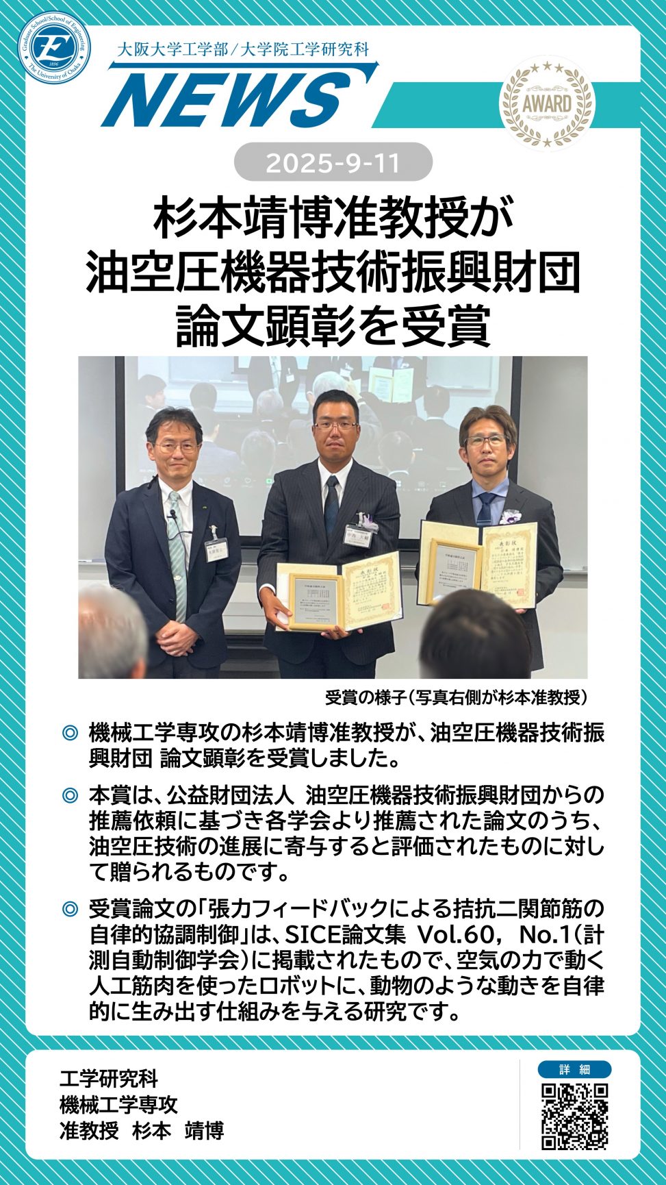 杉本靖博准教授が油空圧機器技術振興財団論文顕彰を受賞しました 詳細ページ https://www.eng.osaka-u.ac.jp/ja/topics/researchresult/26656 2025年9月11日 投稿先 NEWS, 応用理工学科, 機械工学専攻 ← 過去の投稿へ 次の投稿へ →
