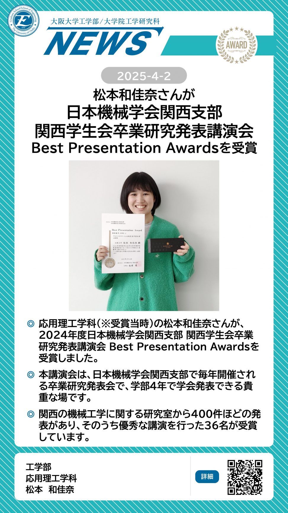 松本和佳奈さんが日本機械学会関西支部 関西学生会卒業研究発表講演会Best Presentation Awardsを受賞しました 詳細ページ https://www.eng.osaka-u.ac.jp/ja/topics/researchresult/24788 2025年4月2日 投稿先 NEWS, 応用理工学科, 機械工学専攻 ← 過去の投稿へ 次の投稿へ →