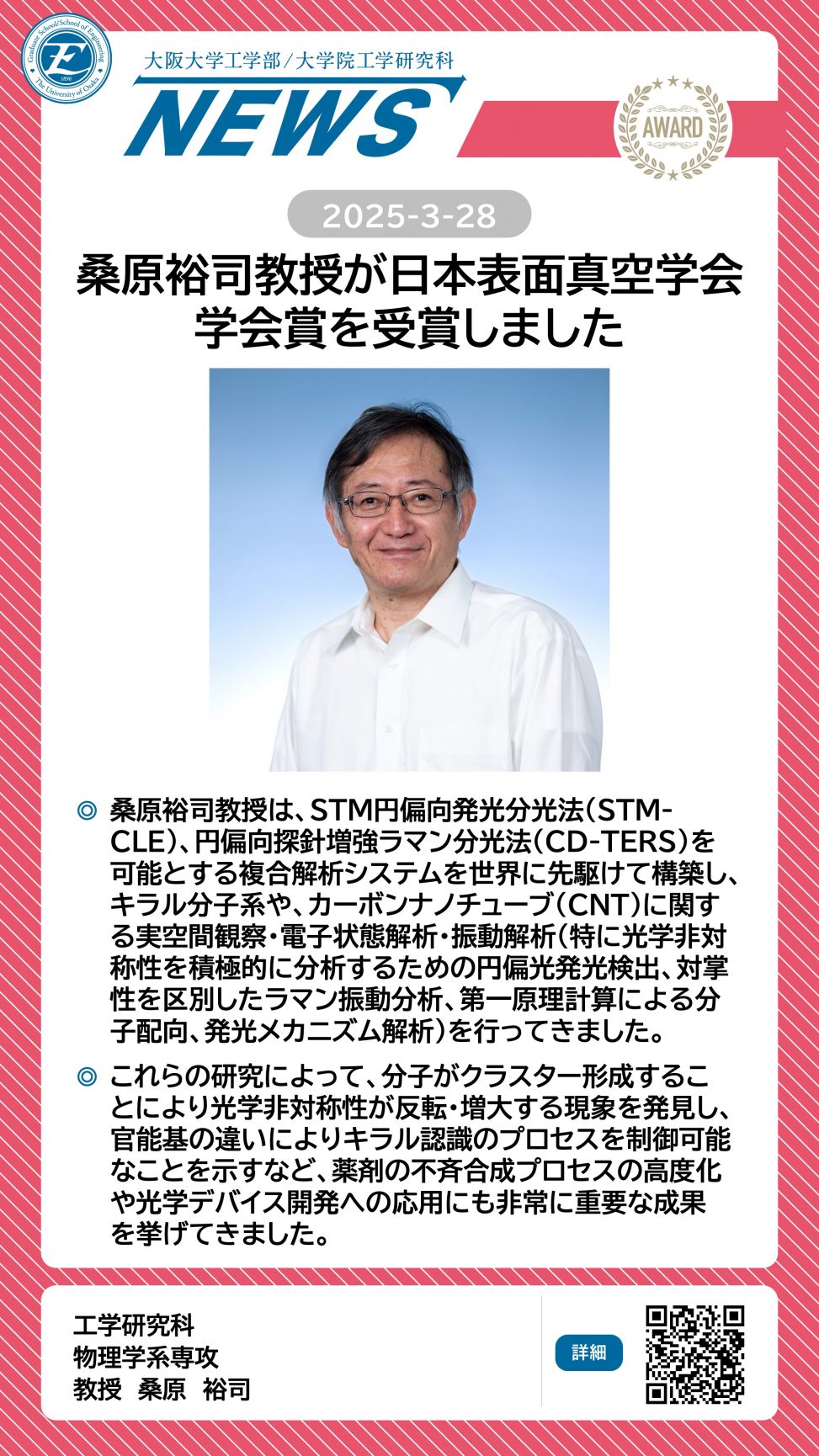 桑原裕司教授が日本表面真空学会 学会賞を受賞しました 詳細ページ https://www.eng.osaka-u.ac.jp/ja/topics/researchresult/24555 2025年3月28日 投稿先 NEWS, 応用自然科学科, 物理学系専攻 ← 過去の投稿へ 次の投稿へ →