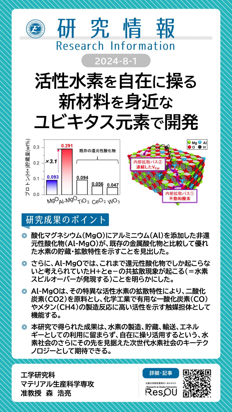 活性水素を自在に操る新材料を身近なユビキタス元素で開発 詳細ページ https://resou.osaka-u.ac.jp/ja/research/2024/20240801_1 2024年8月1日 投稿先 研究情報, 応用理工学科, マテリアル生産科学専攻 ← 過去の投稿へ 次の投稿へ →