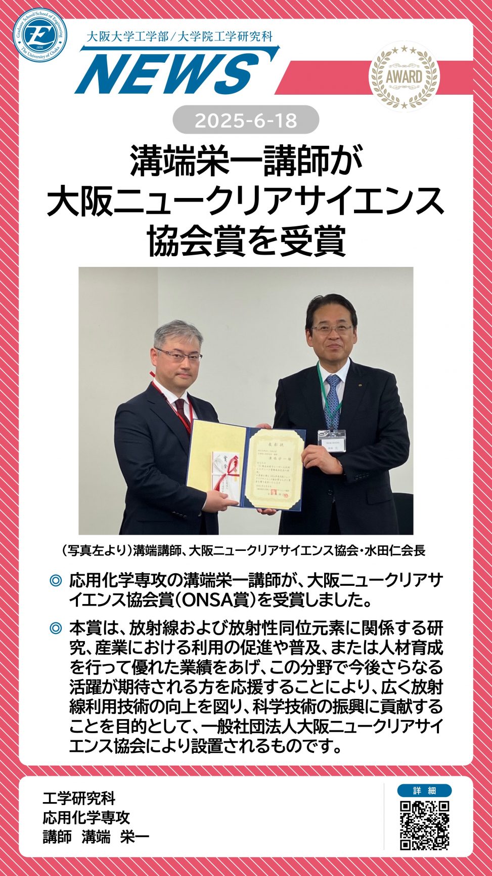 溝端栄一講師が大阪ニュークリアサイエンス協会賞を受賞しました 詳細ページ https://www.eng.osaka-u.ac.jp/ja/topics/researchresult/25471 2025年6月18日 投稿先 応用自然科学科, 応用化学専攻 ← 過去の投稿へ 次の投稿へ →