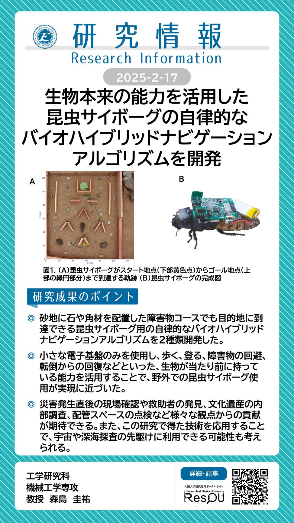 生物本来の能力を活用した昆虫サイボーグの 自律的なバイオハイブリッドナビゲーションアルゴリズムを開発 詳細ページ https://resou.osaka-u.ac.jp/ja/research/2025/20250217_1 2025年2月17日 投稿先 研究情報, 応用理工学科, 機械工学専攻 ← 過去の投稿へ 次の投稿へ →