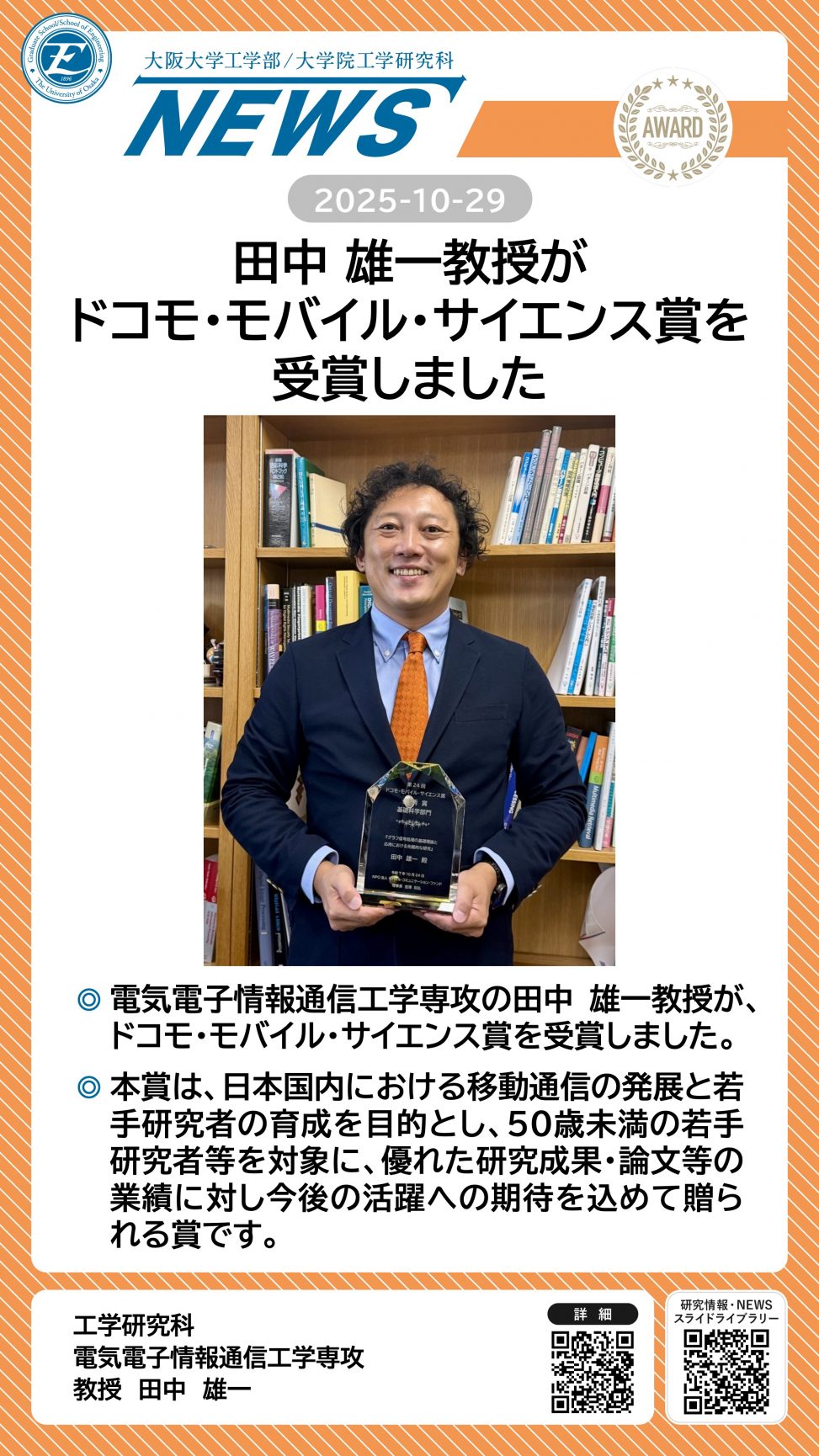 田中 雄一教授がドコモ・モバイル・サイエンス賞を受賞しました 詳細ページ https://www.eng.osaka-u.ac.jp/ja/topics/researchresult/27404 2025年10月29日 投稿先 NEWS, 電子情報工学科, 電気電子情報通信工学専攻 ← 過去の投稿へ 次の投稿へ →