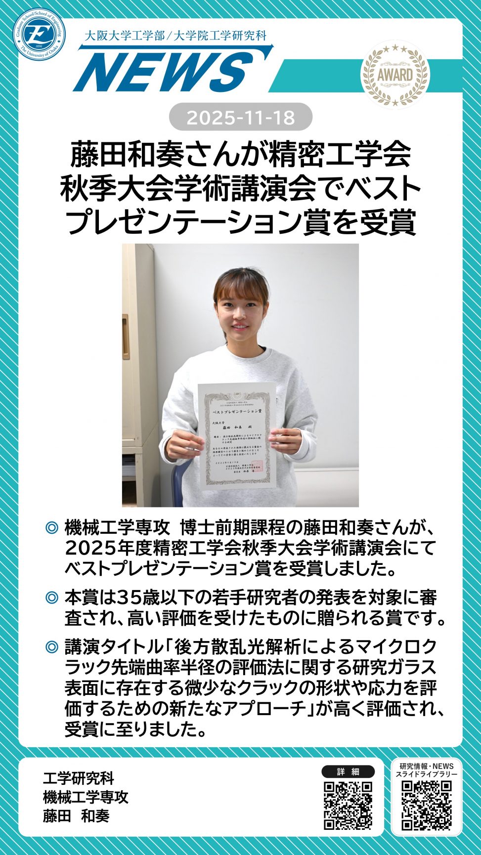 田和奏さんが精密工学会秋季大会学術講演会でベストプレゼンテーション賞を受賞しました 詳細ページ https://www.eng.osaka-u.ac.jp/ja/topics/researchresult/27608 2025年11月18日 投稿先 NEWS, 応用理工学科, 機械工学専攻 ← 過去の投稿へ 次の投稿へ →