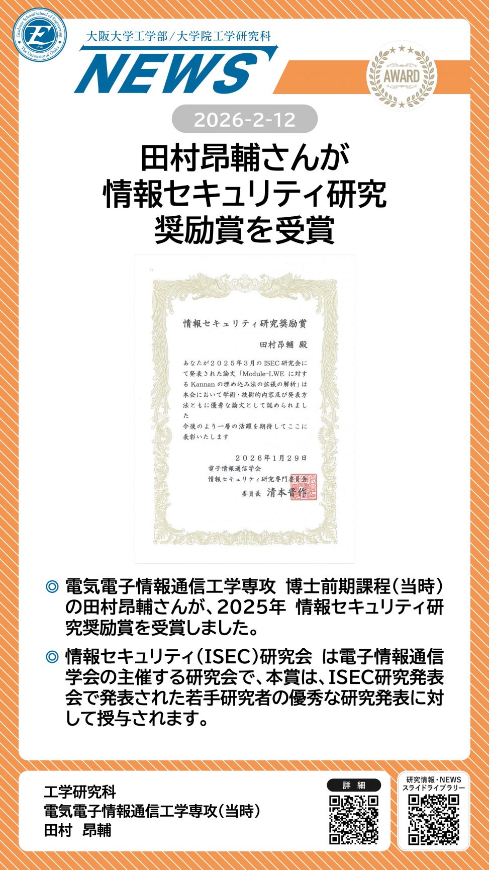 田村昂輔さんが情報セキュリティ研究奨励賞を受賞しました 詳細ページ https://www.eng.osaka-u.ac.jp/ja/topics/researchresult/28620 2026年2月12日 投稿先 NEWS, 電子情報工学科, 電気電子情報通信工学専攻 ← 過去の投稿へ 次の投稿へ →