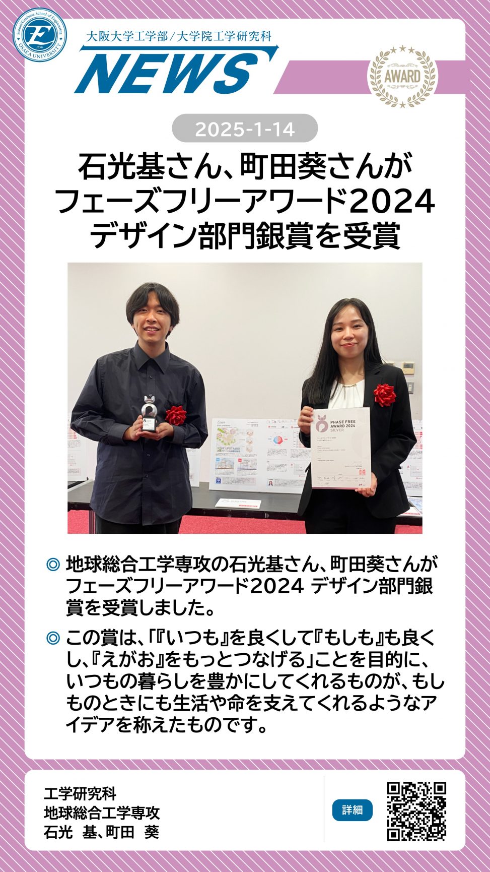 石光基さん、町田葵さんがフェーズフリーアワード2024 アイデア部門 銀賞を受賞しました 詳細ページ https://www.eng.osaka-u.ac.jp/ja/topics/researchresult/23664 2025年1月14日 投稿先 NEWS, 地球総合工学科, 地球総合工学専攻 ← 過去の投稿へ 次の投稿へ →