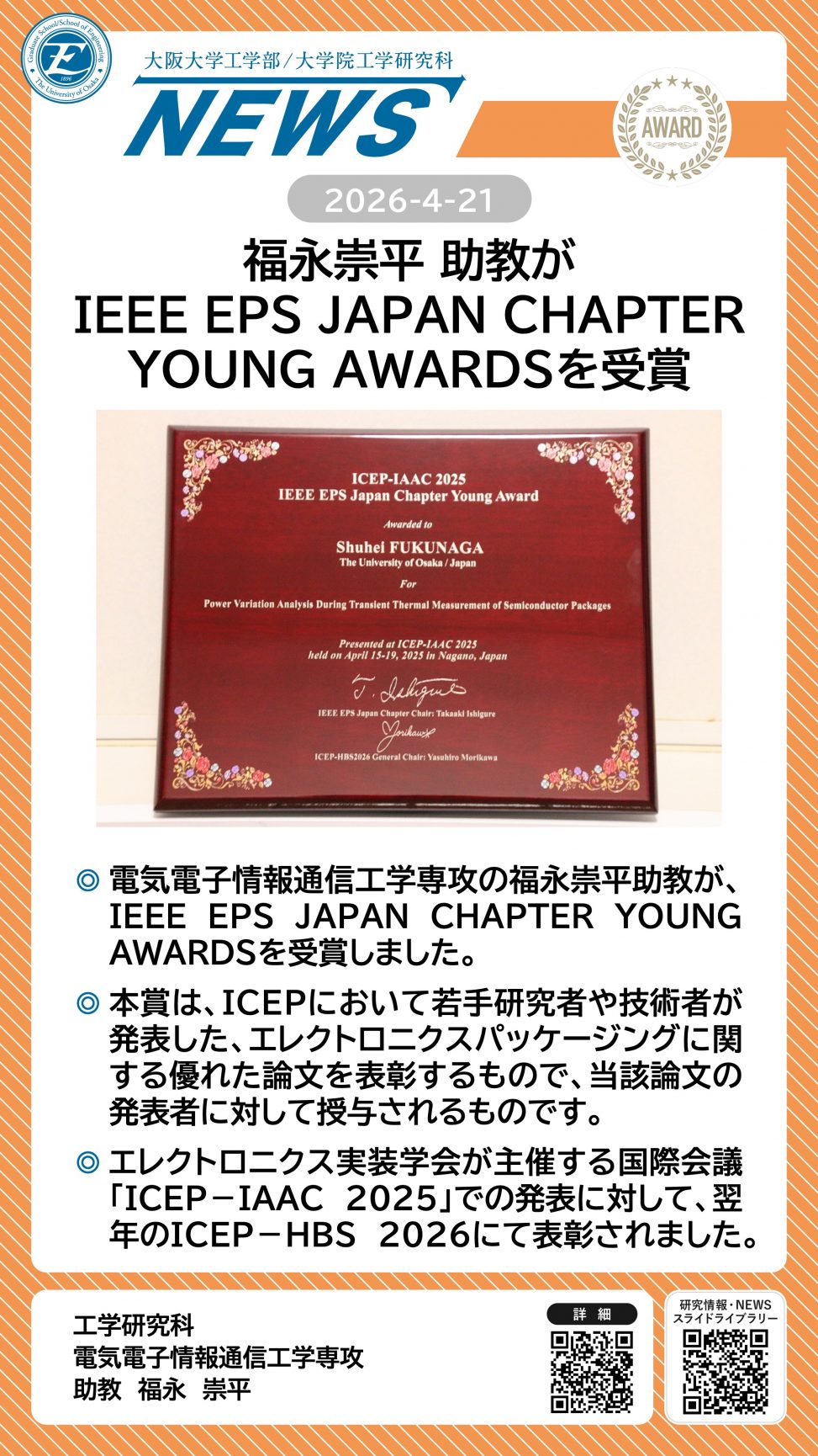 福永崇平助教(電気電子情報通信工学専攻)がIEEE EPS JAPAN CHAPTER YOUNG AWARDSを受賞しました 詳細ページ https://www.eng.osaka-u.ac.jp/ja/topics/researchresult/29404 2026年4月21日 投稿先 NEWS, 電子情報工学科, 電気電子情報通信工学専攻 ← 過去の投稿へ