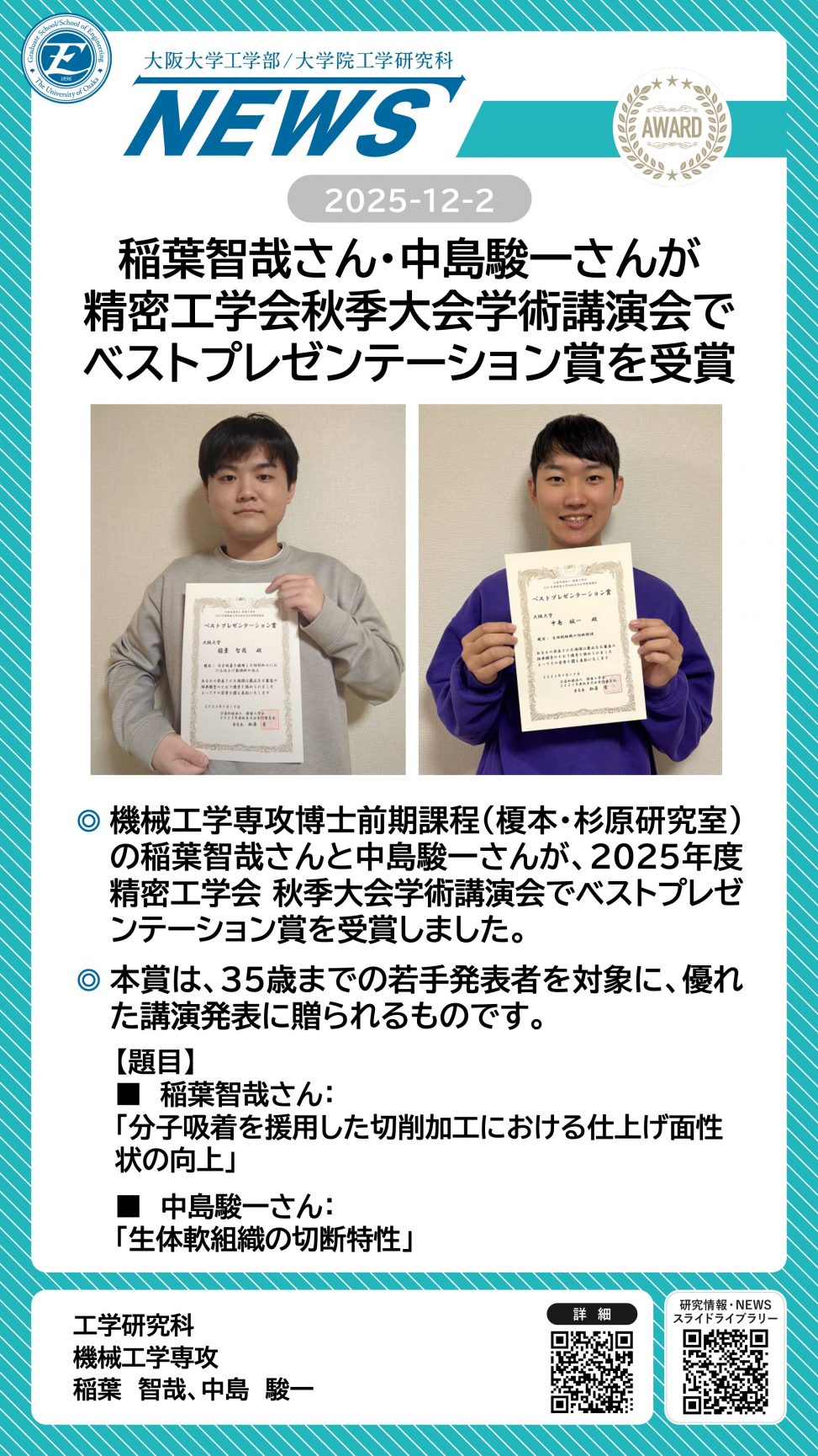 稲葉智哉さん・中島駿一さんが精密工学会秋季大会学術講演会でベストプレゼンテーション賞を受賞しました 詳細ページ https://www.eng.osaka-u.ac.jp/ja/topics/researchresult/27750 2025年12月2日 投稿先 NEWS, 応用理工学科, 機械工学専攻 ← 過去の投稿へ 次の投稿へ →