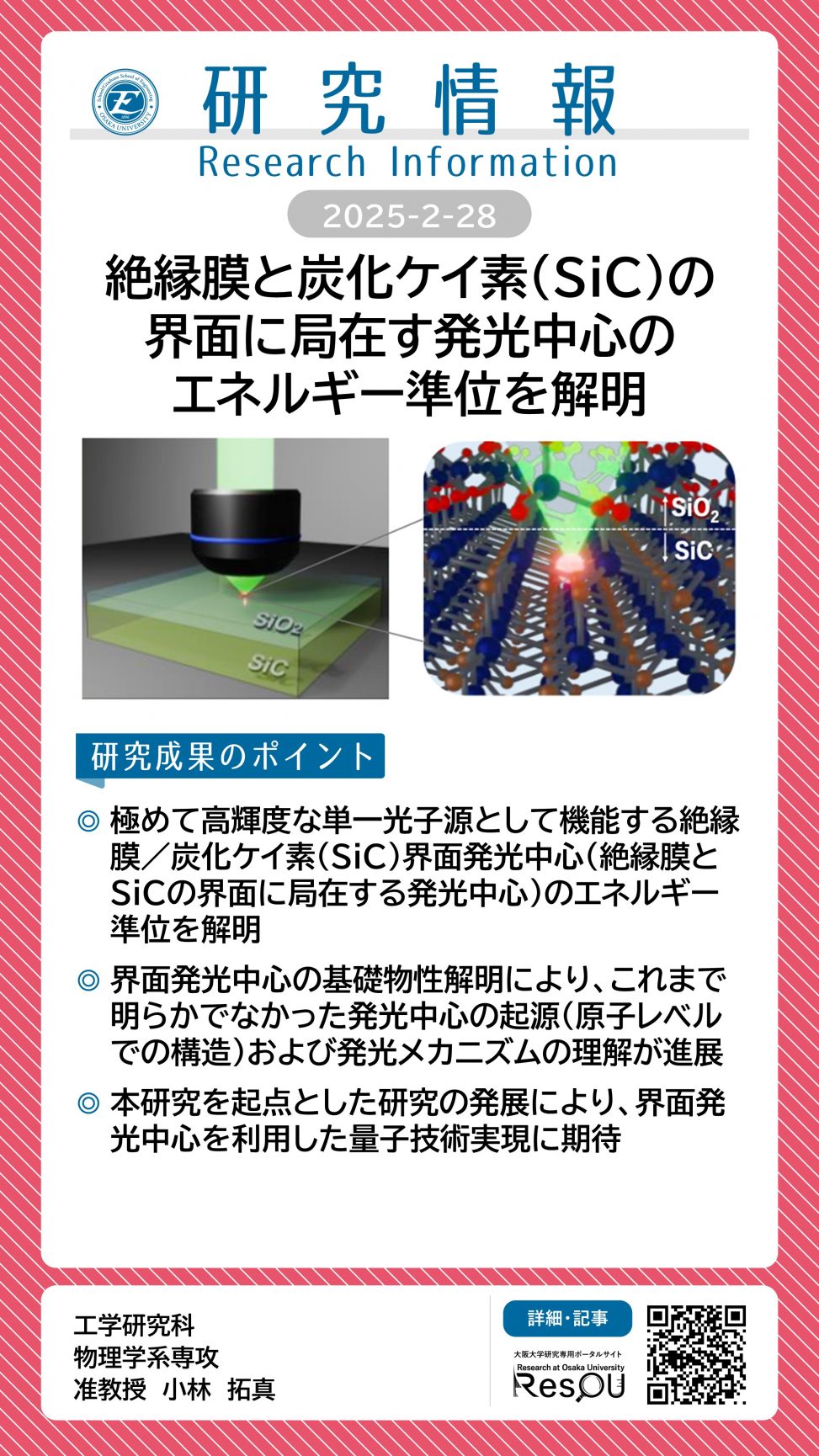 絶縁膜と炭化ケイ素(SiC)の界面に局在する 発光中心のエネルギー準位を解明 詳細ページ https://resou.osaka-u.ac.jp/ja/research/2025/20250228_1 2025年2月28日 投稿先 応用自然科学科, 研究情報, 物理学系専攻 ← 過去の投稿へ 次の投稿へ →