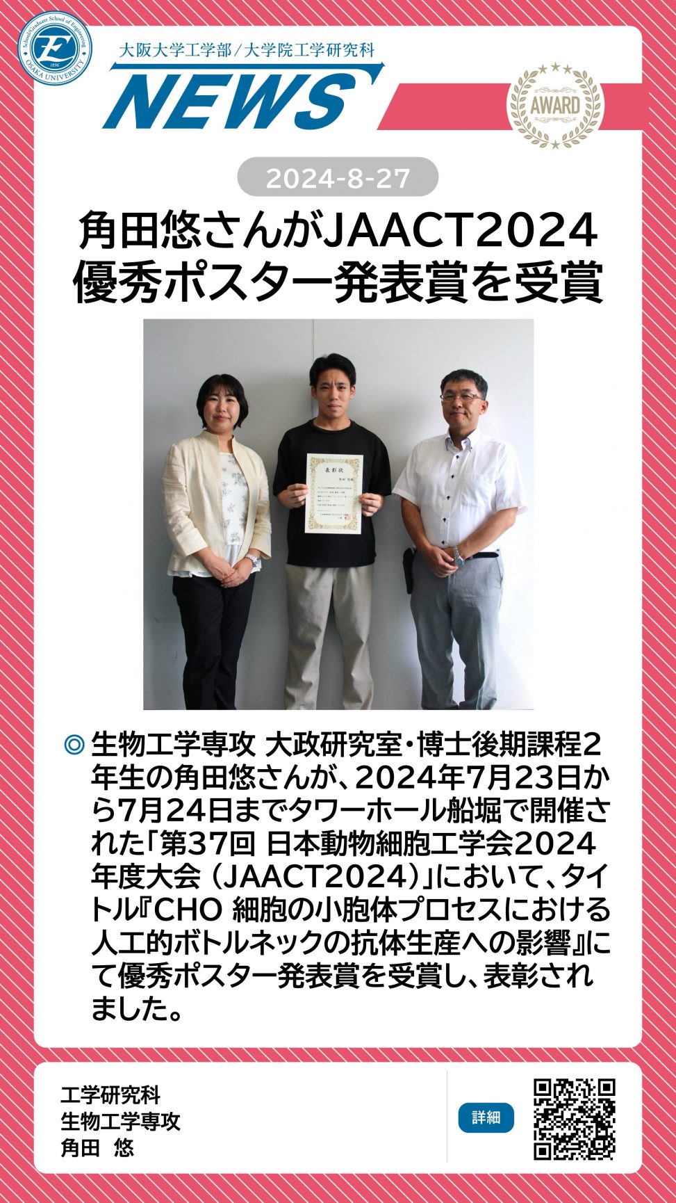 角田悠さんが優秀ポスター発表賞を受賞 詳細ページ https://www.eng.osaka-u.ac.jp/ja/topics/researchresult/21512 2024年8月27日 投稿先 生物工学専攻, 応用自然科学科, NEWS ← 過去の投稿へ 次の投稿へ →