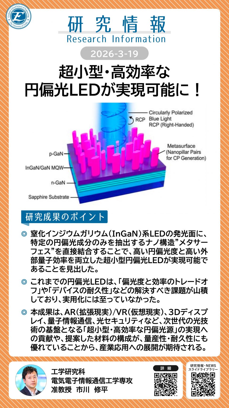 超小型・高効率な円偏光LEDが実現可能に! 詳細ページ https://resou.osaka-u.ac.jp/ja/research/2026/20260319_3 2026年3月19日 投稿先 研究情報, 電子情報工学科, 電気電子情報通信工学専攻 ← 過去の投稿へ 次の投稿へ →