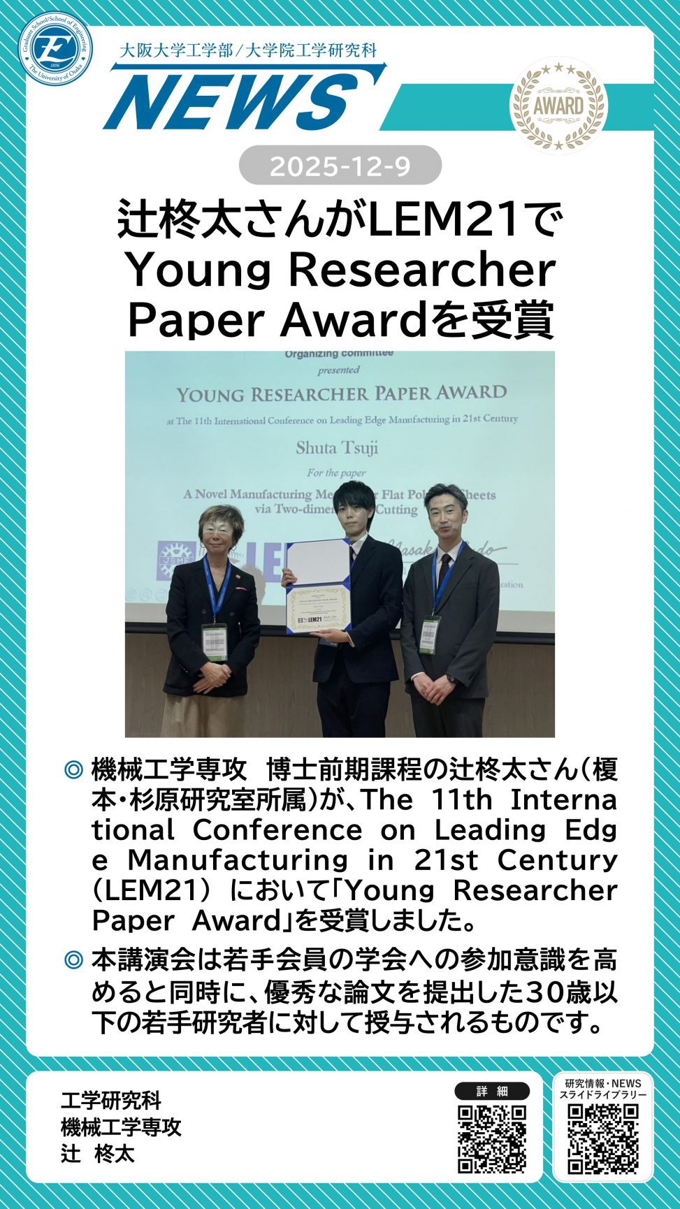 辻柊太さんがLEM21でYoung Researcher Paper Awardを受賞しました 詳細ページ https://www.eng.osaka-u.ac.jp/ja/topics/researchresult/27816 2025年12月9日 投稿先 NEWS, 応用理工学科, 機械工学専攻 ← 過去の投稿へ 次の投稿へ →