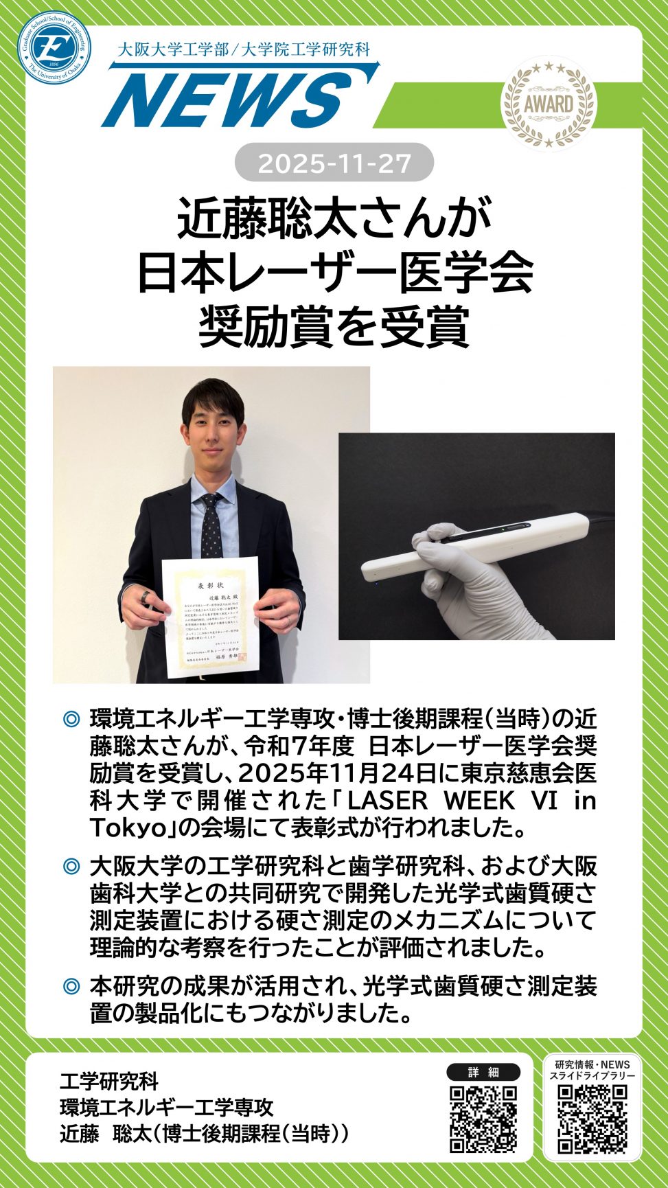 近藤聡太さんが日本レーザー医学会奨励賞を受賞しました 詳細ページ https://www.eng.osaka-u.ac.jp/ja/topics/researchresult/27701 2025年11月27日 投稿先 NEWS, 環境・エネルギー工学科, 環境エネルギー工学専攻 ← 過去の投稿へ 次の投稿へ →