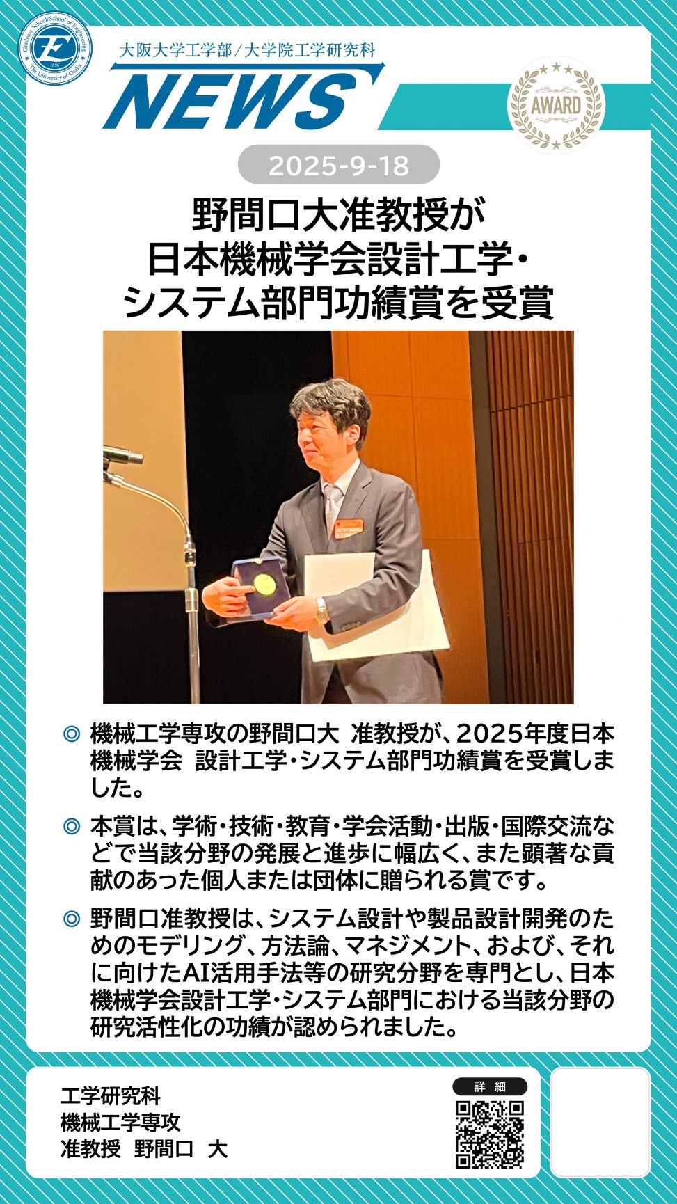 野間口大准教授が日本機械学会設計工学・システム部門功績賞を受賞しました 詳細ページ https://www.eng.osaka-u.ac.jp/ja/topics/researchresult/26740 2025年9月18日 投稿先 NEWS, 応用理工学科, 機械工学専攻 ← 過去の投稿へ 次の投稿へ →