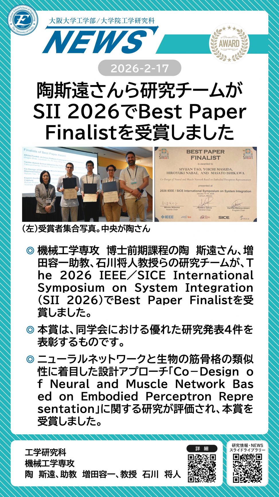陶斯遠さんら研究チームがSII 2026でBest Paper Finalistを受賞しました 詳細ページ https://www.eng.osaka-u.ac.jp/ja/topics/researchresult/28661 2026年2月17日 投稿先 NEWS, 応用理工学科, 機械工学専攻 ← 過去の投稿へ 次の投稿へ →