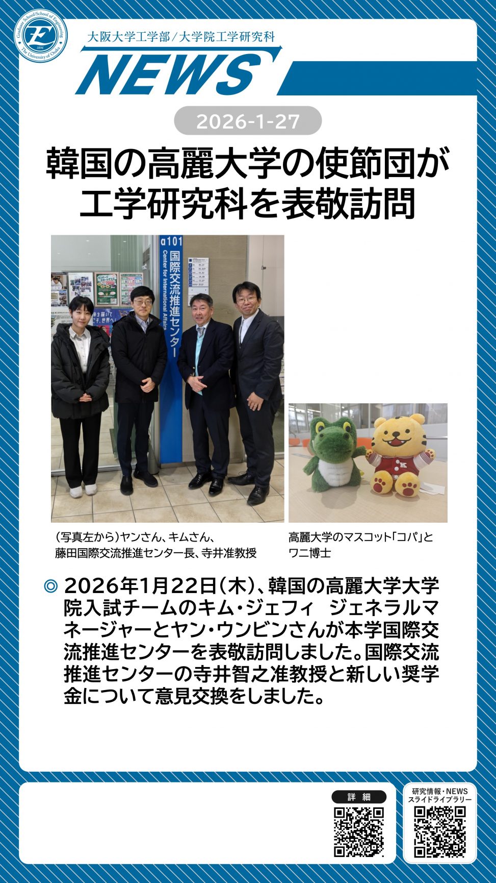 韓国の高麗大学の使節団が工学研究科を表敬訪問しました 詳細ページ https://www.eng.osaka-u.ac.jp/ja/topics/news/28353 2026年1月27日 投稿先 NEWS ← 過去の投稿へ 次の投稿へ →