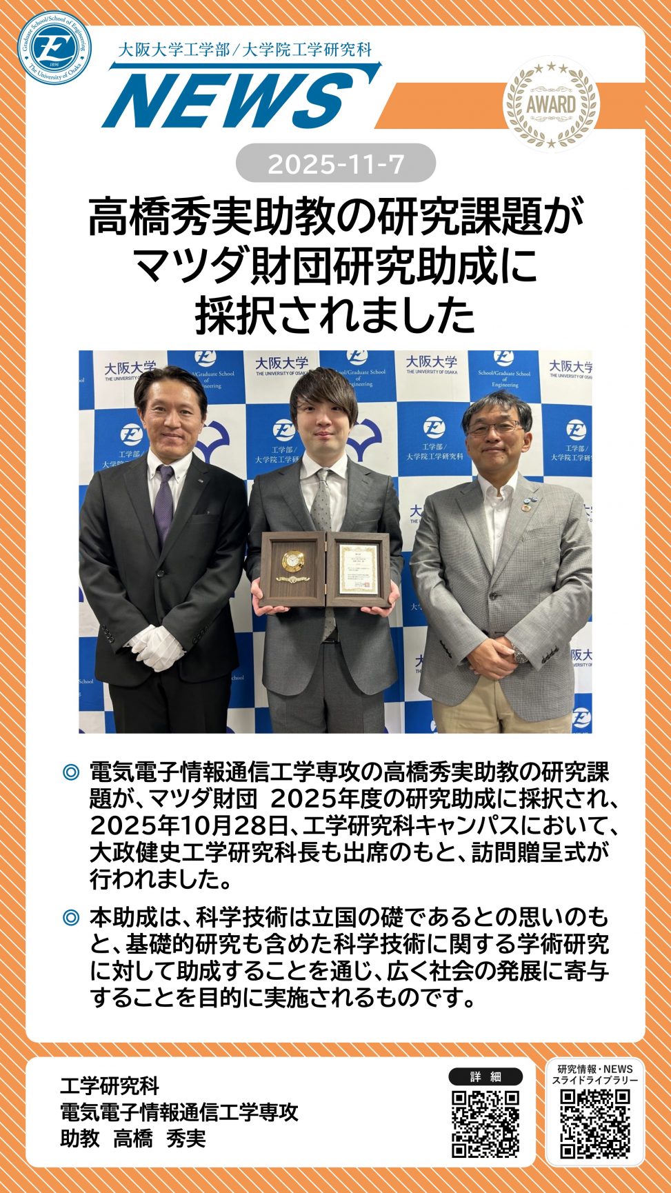 高橋秀実助教の研究課題がマツダ財団研究助成に採択されました 詳細ページ https://www.eng.osaka-u.ac.jp/ja/topics/researchresult/27516 2025年11月7日 投稿先 NEWS, 電子情報工学科, 電気電子情報通信工学専攻 ← 過去の投稿へ 次の投稿へ →