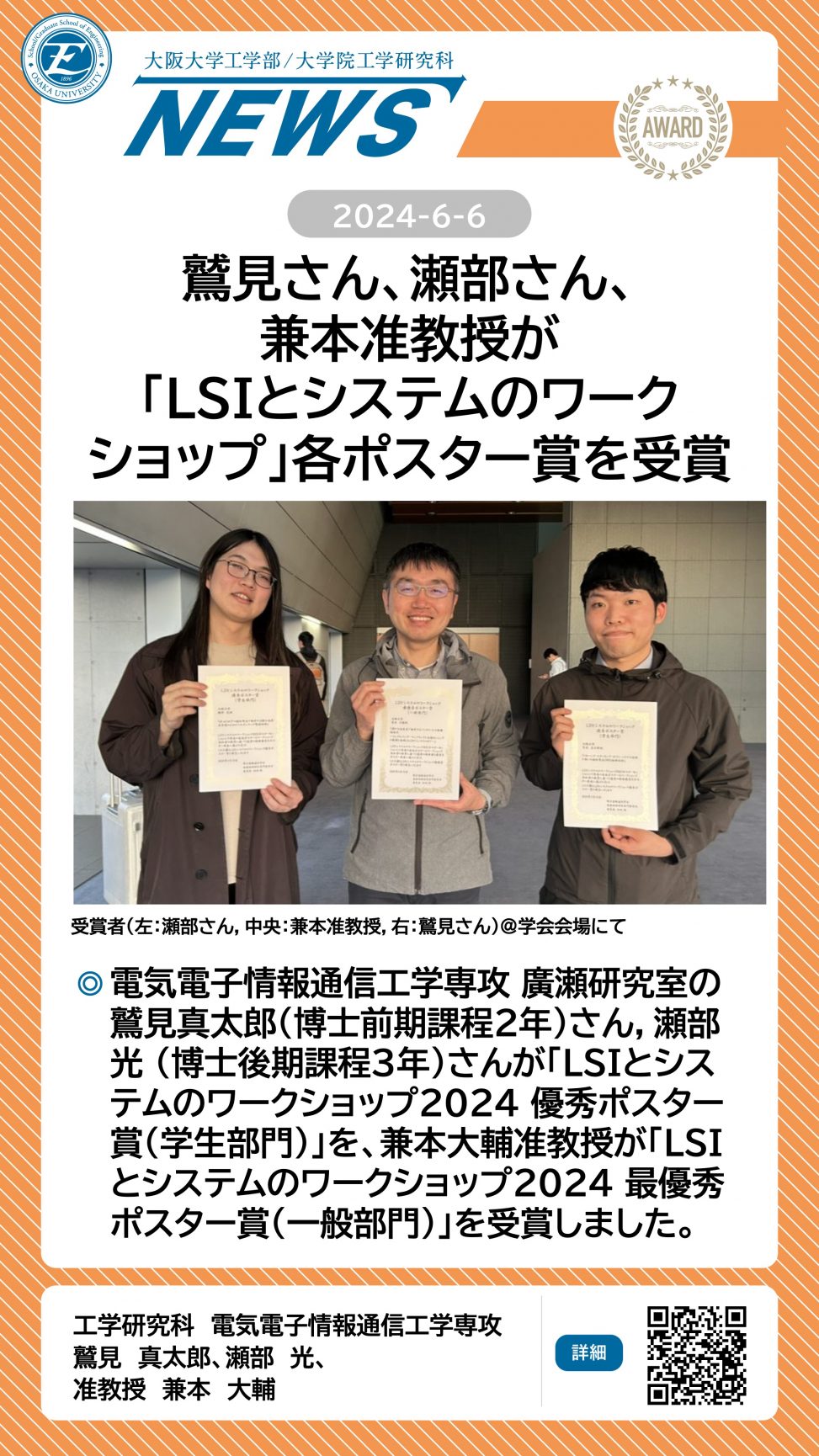 鷲見さん・瀬部さん・兼本准教授が「LSIとシステムのワークショップ」各ポスター賞を受賞 詳細ページ https://www.eng.osaka-u.ac.jp/ja/topics/researchresult/20723 2024年6月6日 投稿先 NEWS, 電子情報工学科, 電気電子情報通信工学専攻 ← 過去の投稿へ 次の投稿へ →
